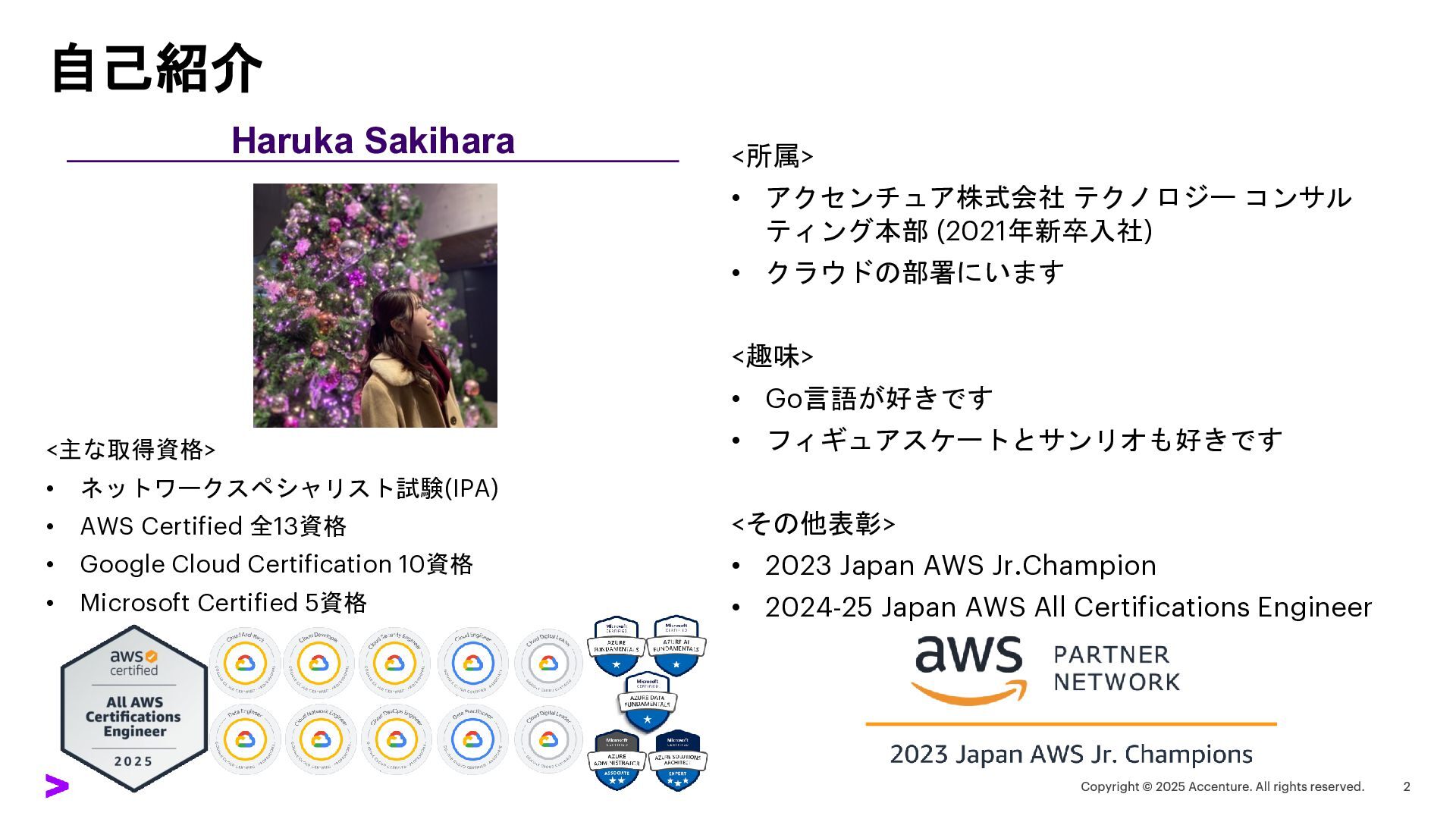 • Google Cloud Certification 10資格 • Microsoft Certified 5資格 <所属> • アクセンチュア株式会社 テクノロジー コンサル ティング本部 (2021年新卒入社) • クラウドの部署にいます <趣味> • Go言語が好きです • フィギュアスケートとサンリオも好きです <その他表彰> • 2023 Japan AWS Jr.Champion • 2024-25 Japan AWS All Certifications Engineer