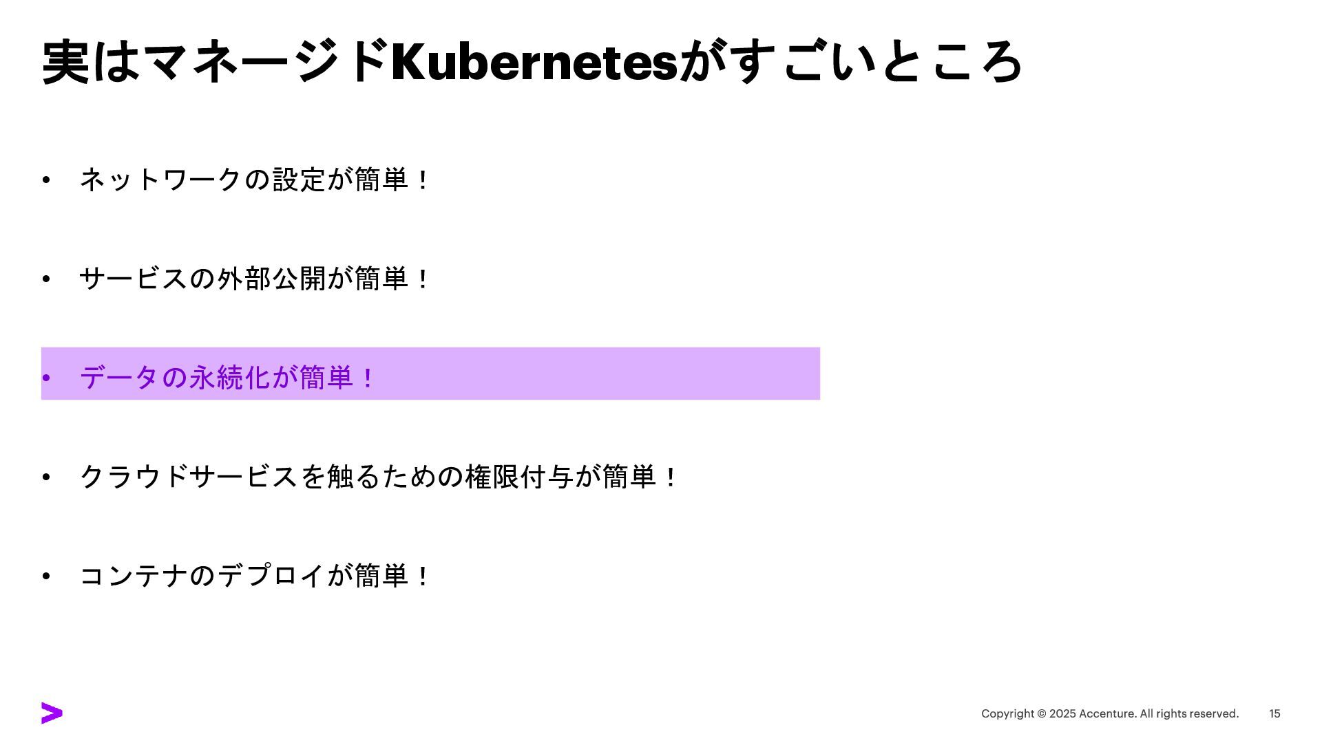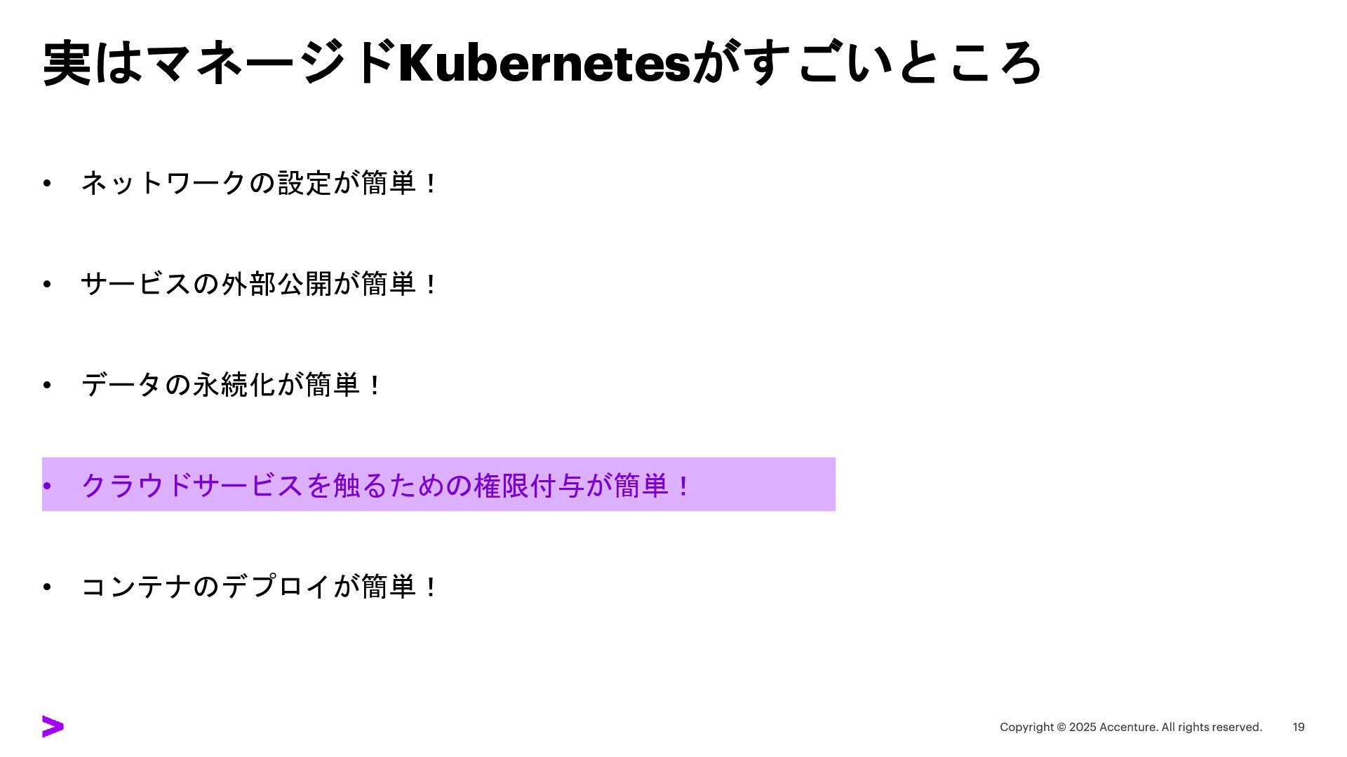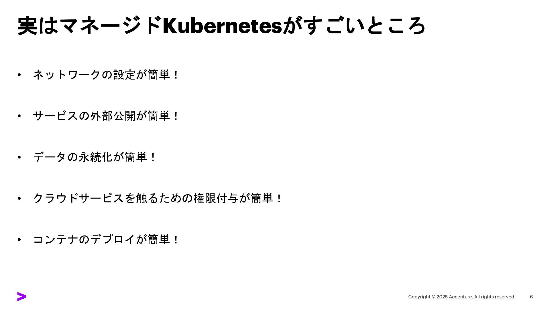 実はマネージドKubernetesがすごいところ • ネットワークの設定が簡単! • サービスの外部公開が簡単! • データの永続化が簡単! • クラウドサービスを触るための権限付与が簡単! •