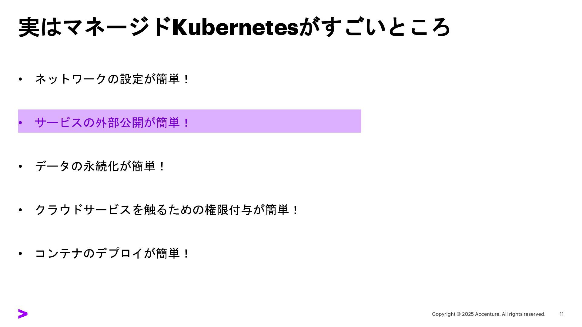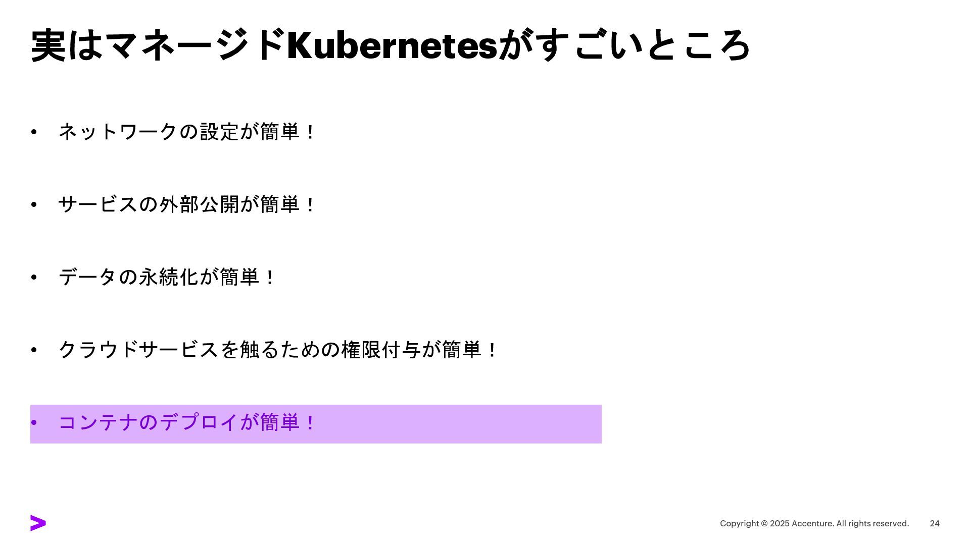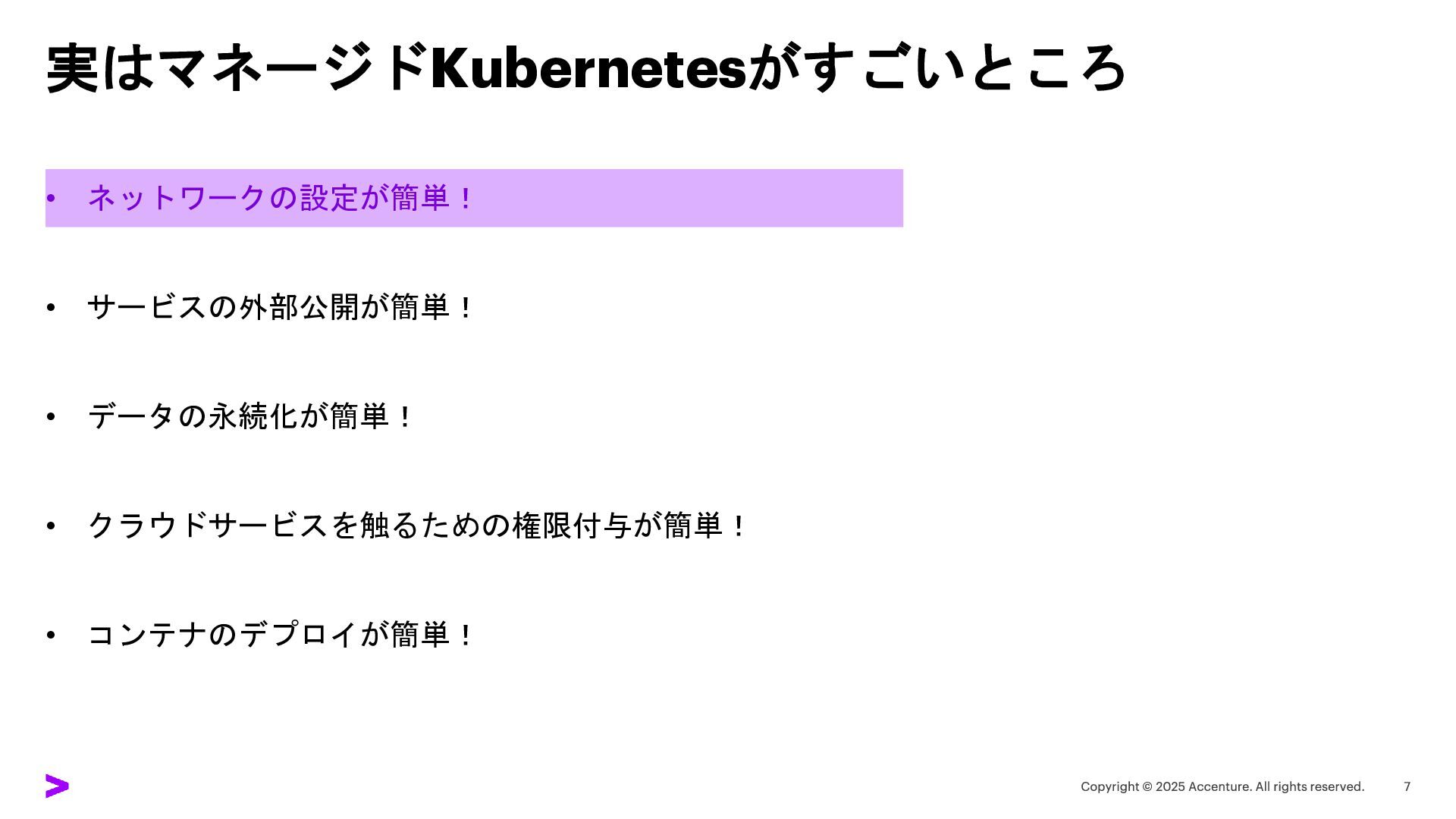 実はマネージドKubernetesがすごいところ • ネットワークの設定が簡単! • サービスの外部公開が簡単! • データの永続化が簡単! • クラウドサービスを触るための権限付与が簡単! •