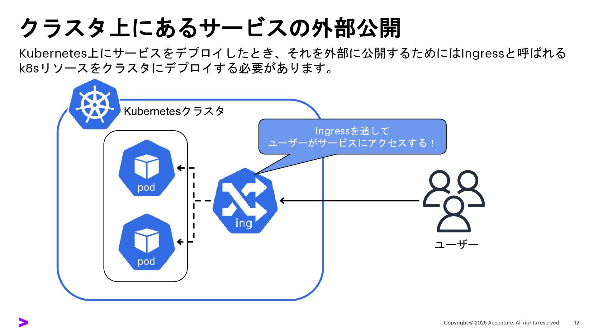クラスタ上にあるサービスの外部公開 Kubernetes上にサービスをデプロイしたとき、それを外部に公開するためにはIngressと呼ばれる k8sリソースをクラスタにデプロイする必要があります。 Kubernetesクラスタ ユーザー Ingressを通して ユーザーがサービスにアクセスする!