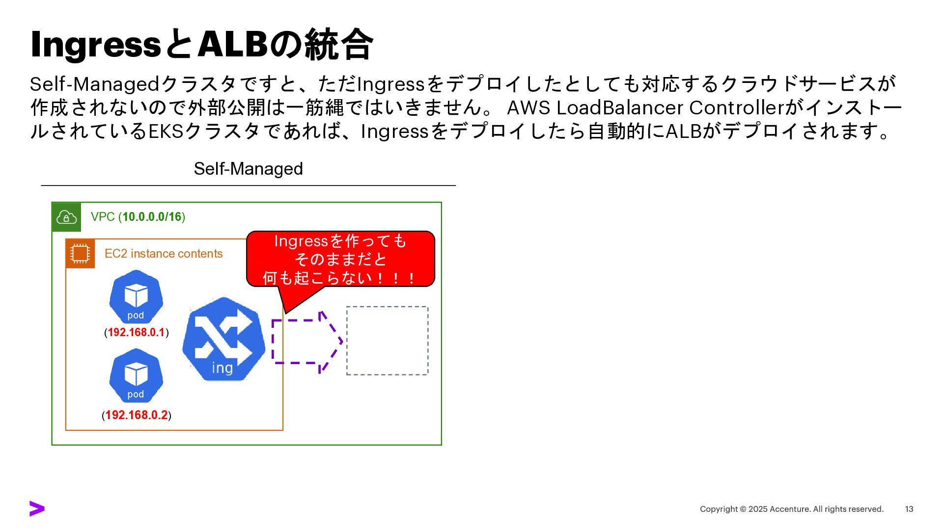 EC2 instance contents (192.168.0.1) (192.168.0.2) Ingressを作っても そのままだと 何も起こらない!!!