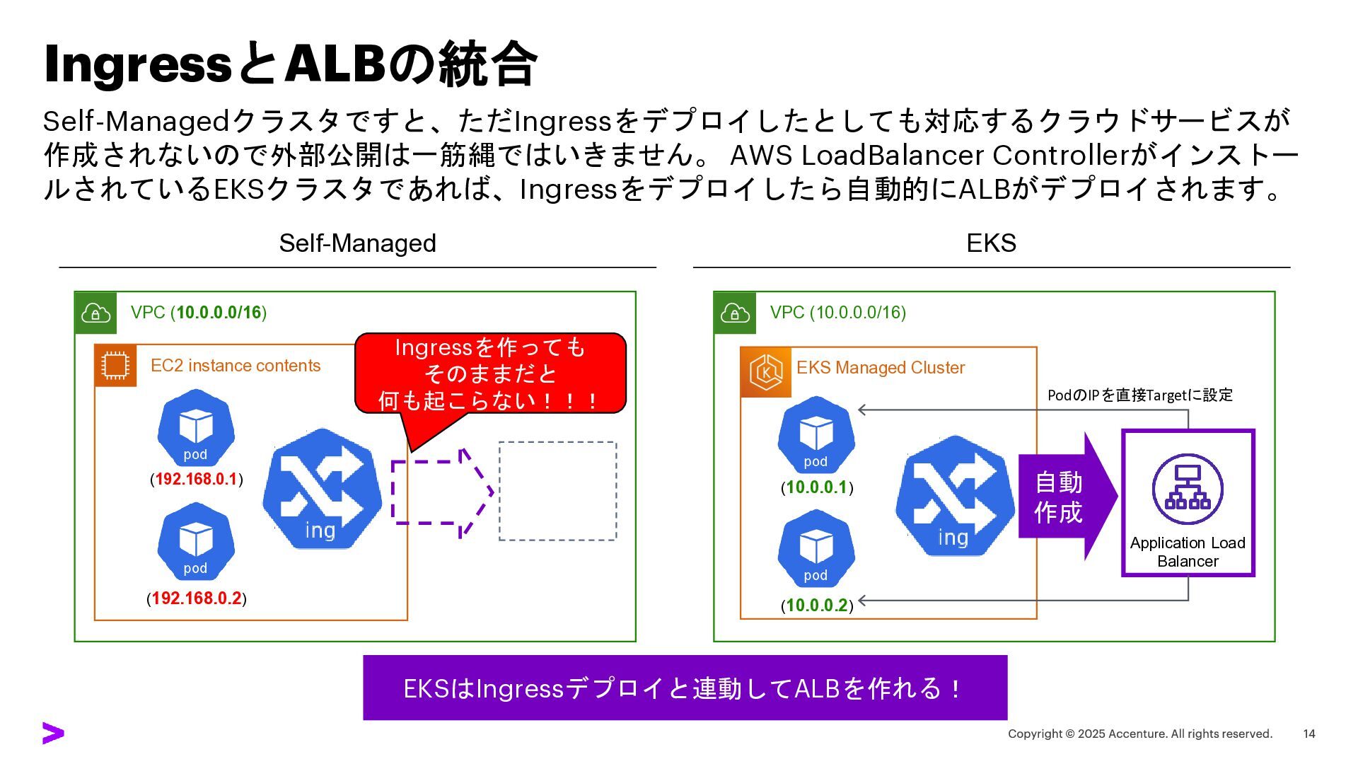 IngressとALBの統合 Self-Managedクラスタですと、ただIngressをデプロイしたとしても対応するクラウドサービスが 作成されないので外部公開は一筋縄ではいきません。 AWS LoadBalancer Controllerがインストー ルされているEKSクラスタであれば、Ingressをデプロイしたら自動的にALBがデプロイされます。 Self-Managed VPC (10.0.0.0/16)