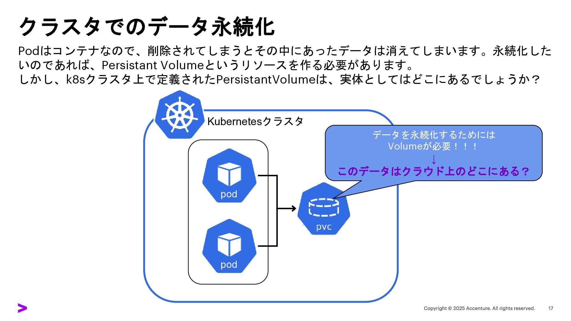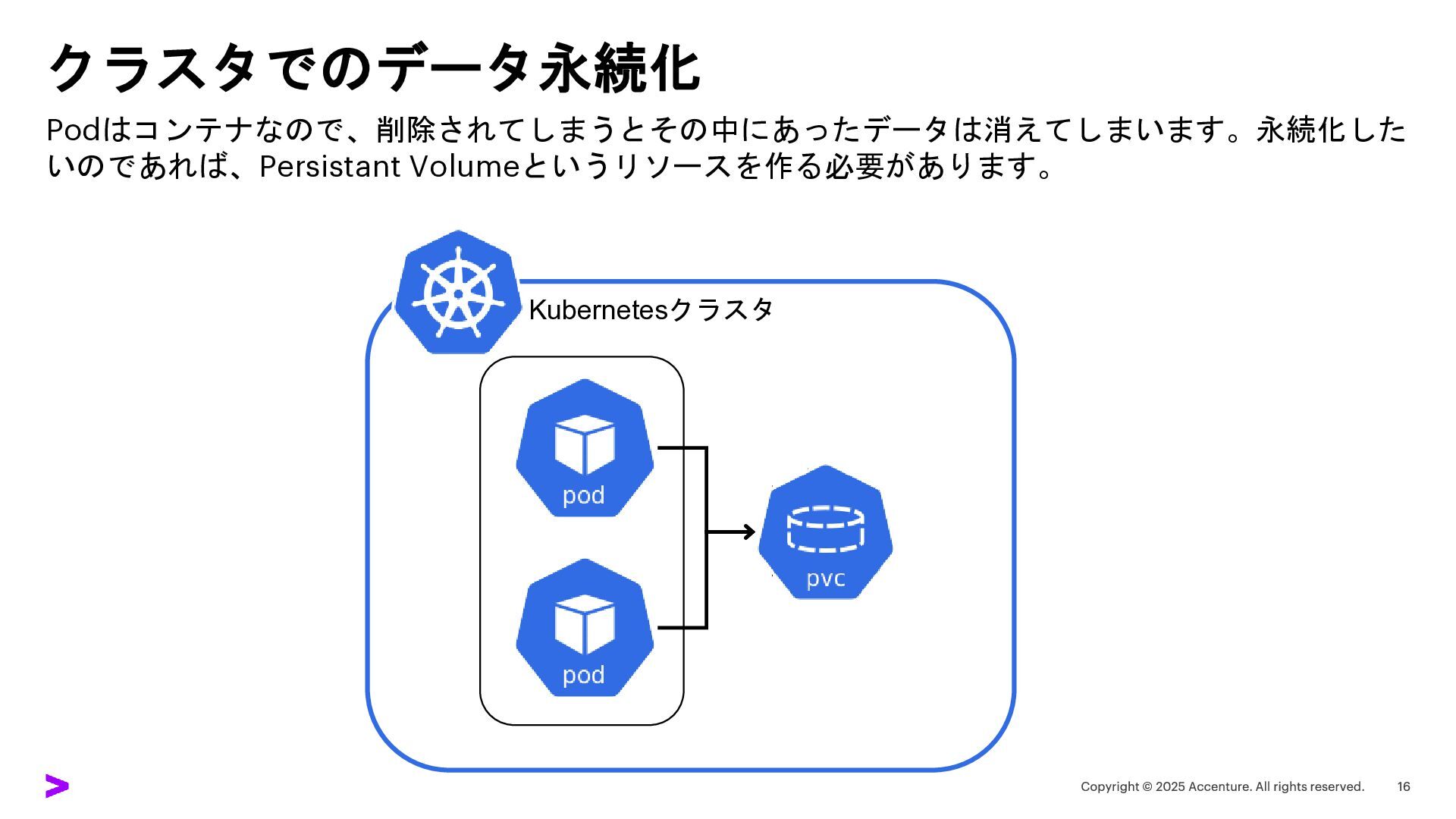 クラスタでのデータ永続化 Podはコンテナなので、削除されてしまうとその中にあったデータは消えてしまいます。永続化した いのであれば、Persistant Volumeというリソースを作る必要があります。 Kubernetesクラスタ