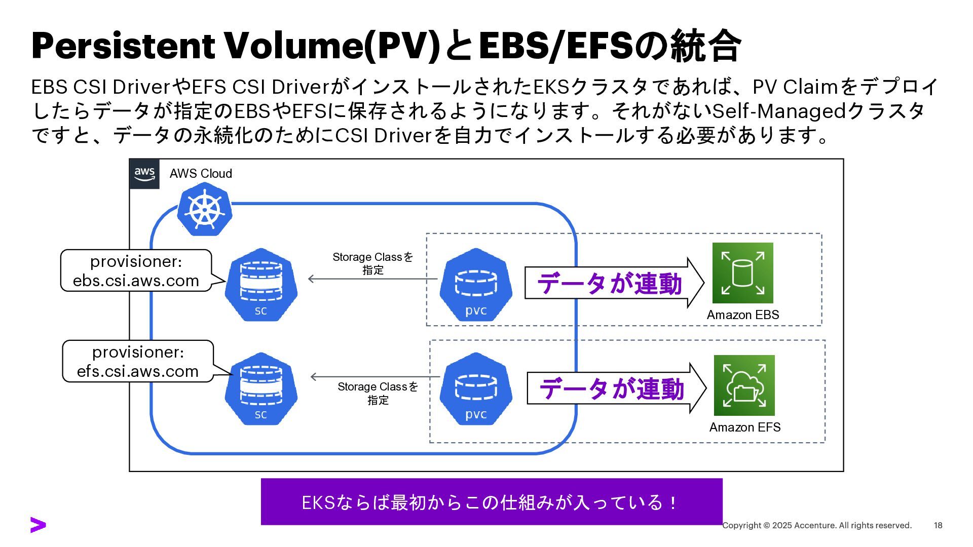 Persistent Volume(PV)とEBS/EFSの統合 EBS CSI DriverやEFS CSI DriverがインストールされたEKSクラスタであれば、PV Claimをデプロイ したらデータが指定のEBSやEFSに保存されるようになります。それがないSelf-Managedクラスタ ですと、データの永続化のためにCSI