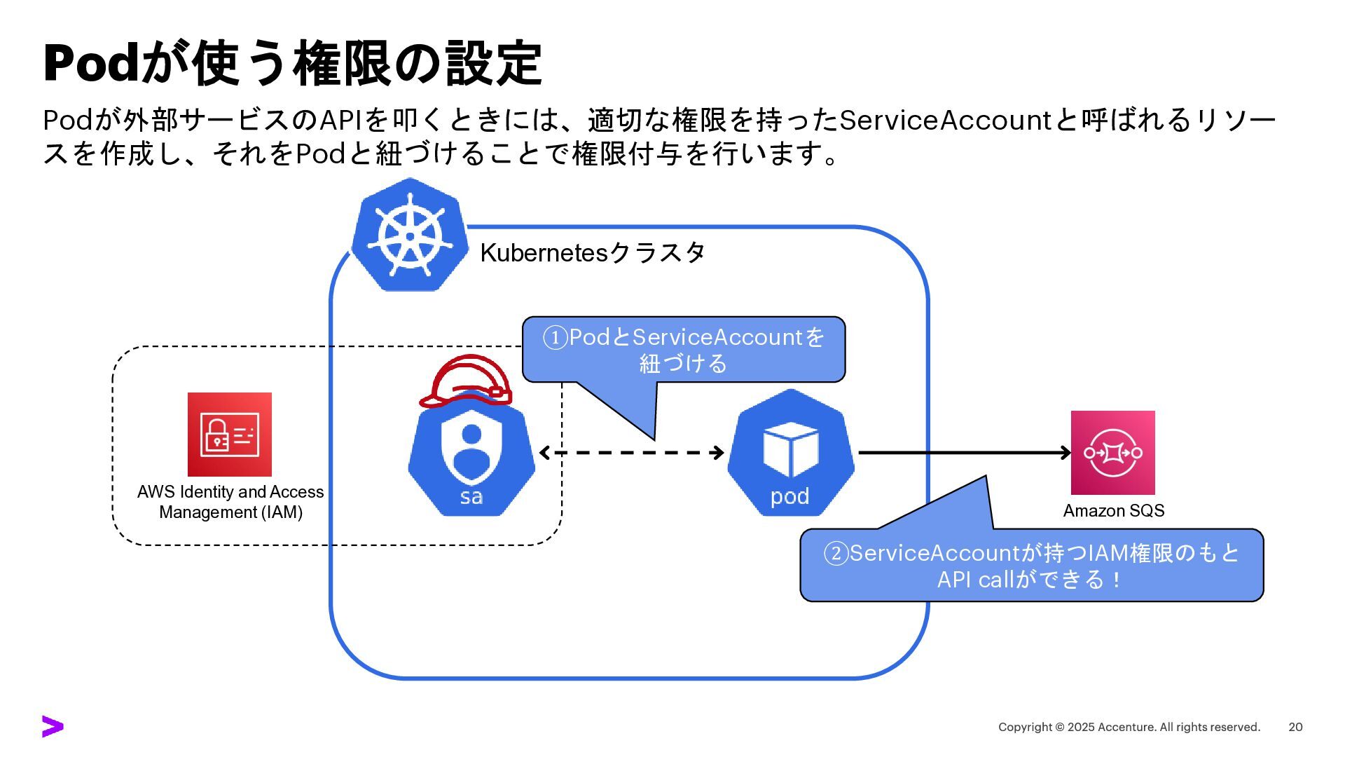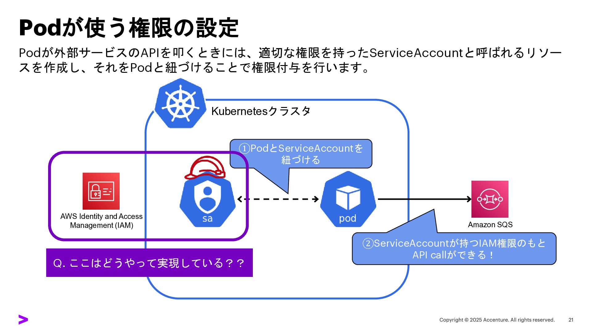 Identity and Access Management (IAM) ①PodとServiceAccountを 紐づける Q. ここはどうやって実現している??
