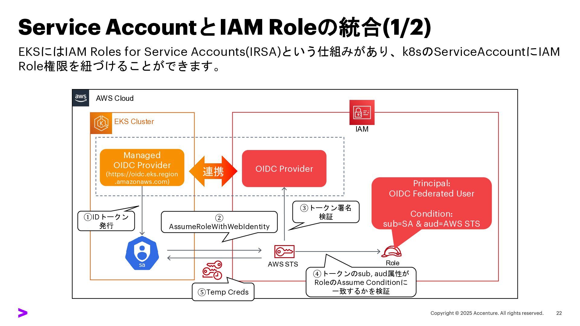 Cluster AWS Cloud Role IAM OIDC Provider Managed OIDC Provider (https://oidc.eks.region .amazonaws.com) AWS STS ④トークンのsub, aud属性が RoleのAssume Conditionに 一致するかを検証 ② AssumeRoleWithWebIdentity Principal: OIDC Federated User Condition: sub=SA & aud=AWS STS ⑤Temp Creds ①IDトークン 発行 ③トークン署名 検証 連携