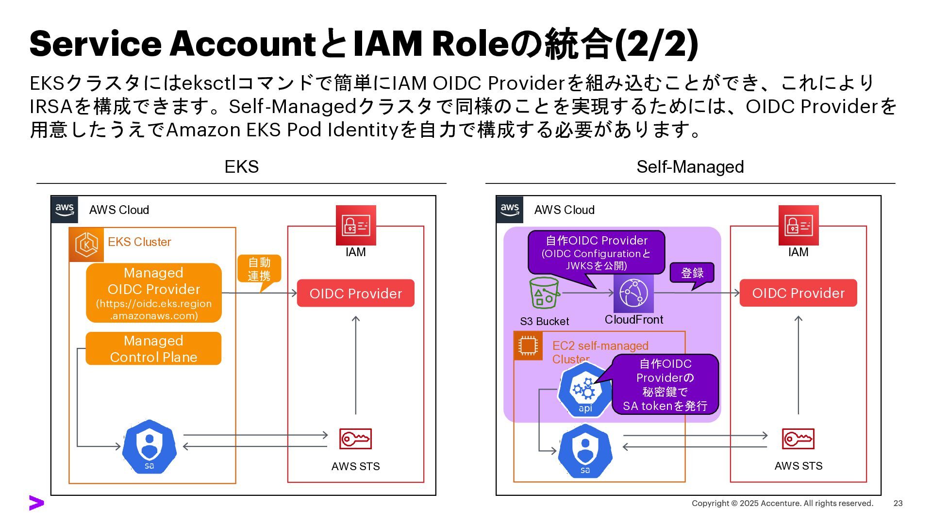 Service AccountとIAM Roleの統合(2/2) EKSクラスタにはeksctlコマンドで簡単にIAM OIDC Providerを組み込むことができ、これにより IRSAを構成できます。Self-Managedクラスタで同様のことを実現するためには、OIDC Providerを 用意したうえでAmazon EKS