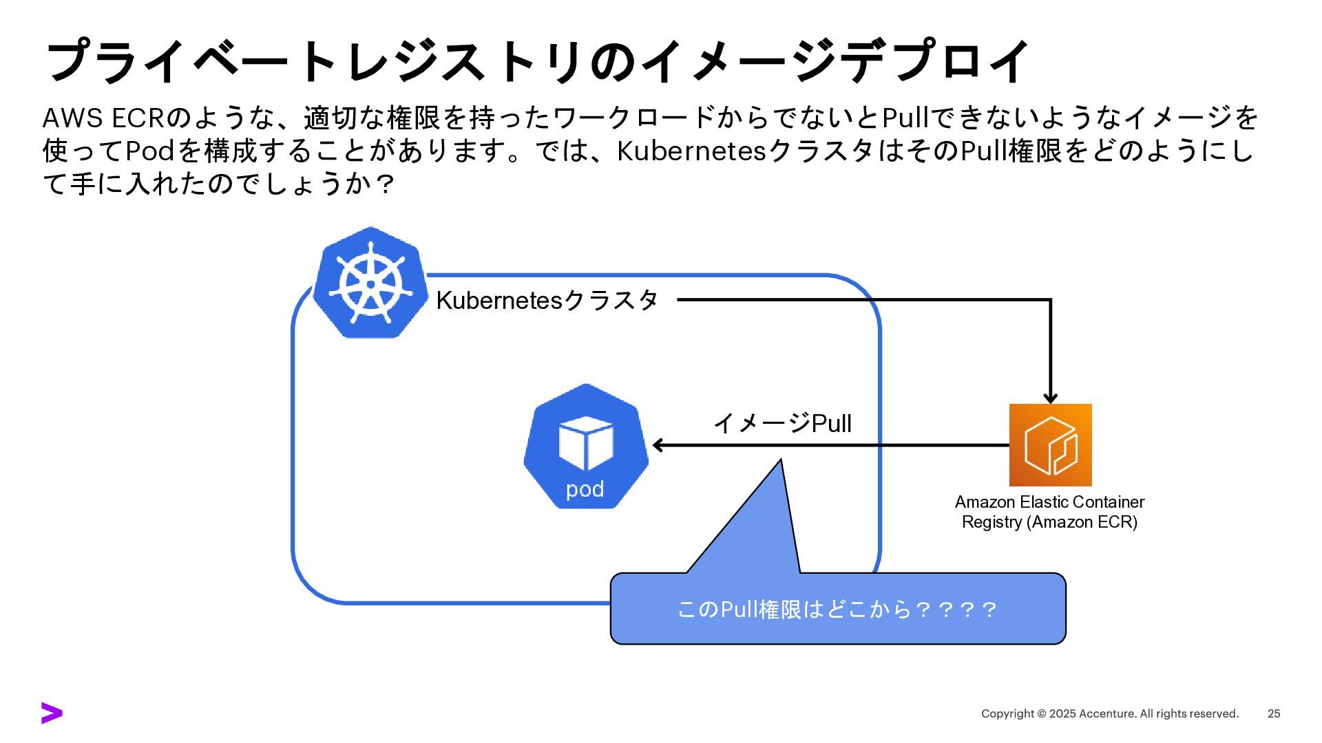 プライベートレジストリのイメージデプロイ AWS ECRのような、適切な権限を持ったワークロードからでないとPullできないようなイメージを 使ってPodを構成することがあります。では、KubernetesクラスタはそのPull権限をどのようにし て手に入れたのでしょうか? Kubernetesクラスタ このPull権限はどこから???? Amazon Elastic Container