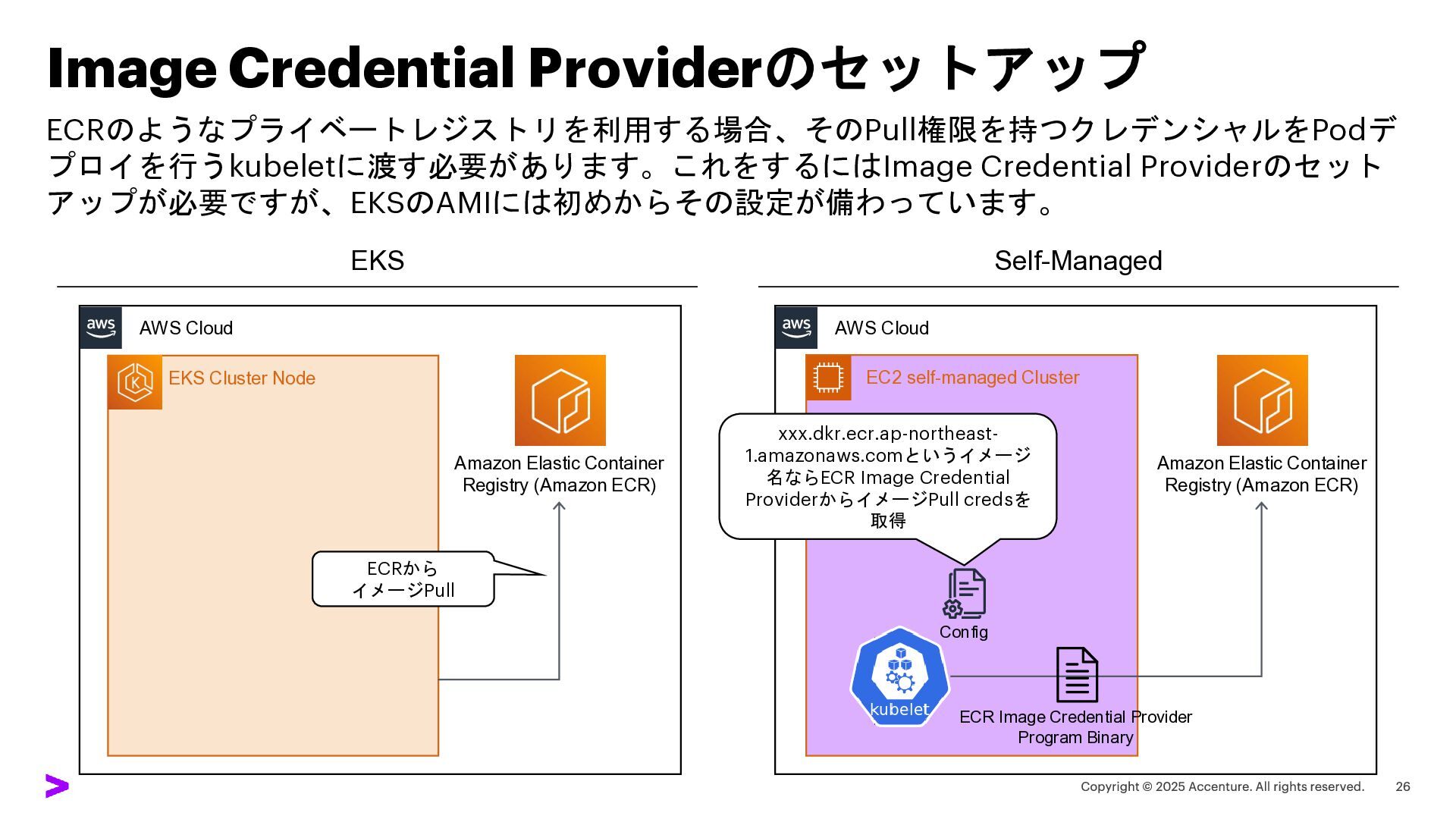 アップが必要ですが、EKSのAMIには初めからその設定が備わっています。 EKS Self-Managed EC2 self-managed Cluster AWS Cloud AWS Cloud xxx.dkr.ecr.ap-northeast- 1.amazonaws.comというイメージ 名ならECR Image Credential ProviderからイメージPull credsを 取得 Amazon Elastic Container Registry (Amazon ECR) Amazon Elastic Container Registry (Amazon ECR) ECRから イメージPull Config ECR Image Credential Provider Program Binary