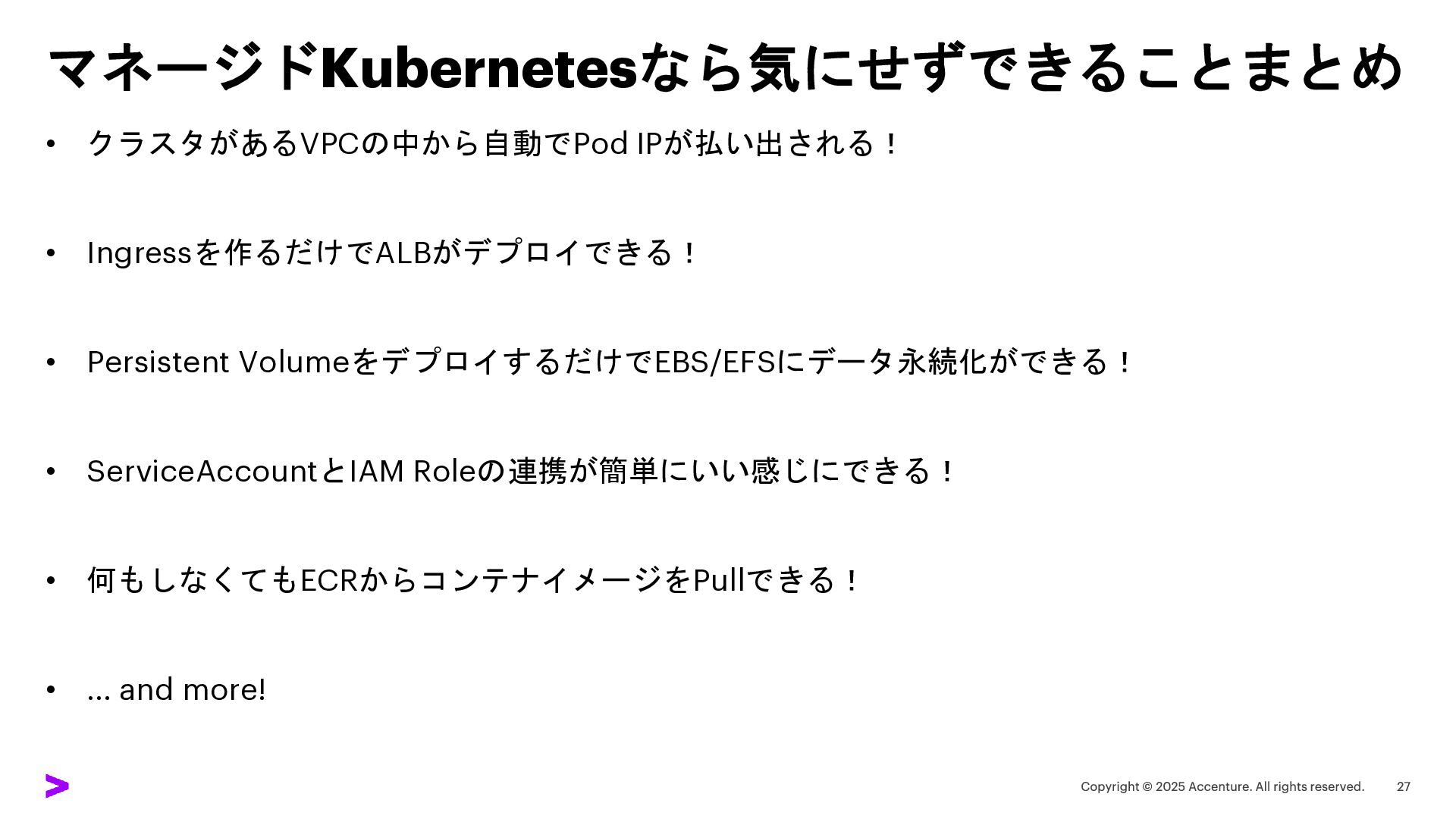 マネージドKubernetesなら気にせずできることまとめ • クラスタがあるVPCの中から自動でPod IPが払い出される! • Ingressを作るだけでALBがデプロイできる! • Persistent VolumeをデプロイするだけでEBS/EFSにデータ永続化ができる! •