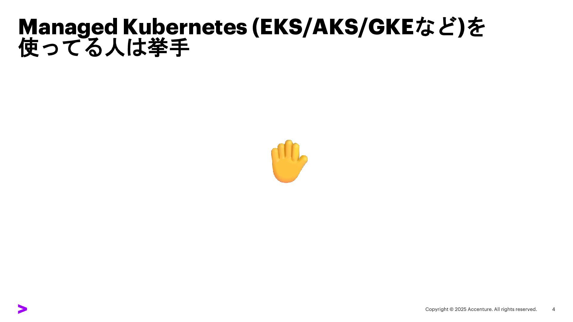 Managed Kubernetes (EKS/AKS/GKEなど)を 使ってる人は挙手
