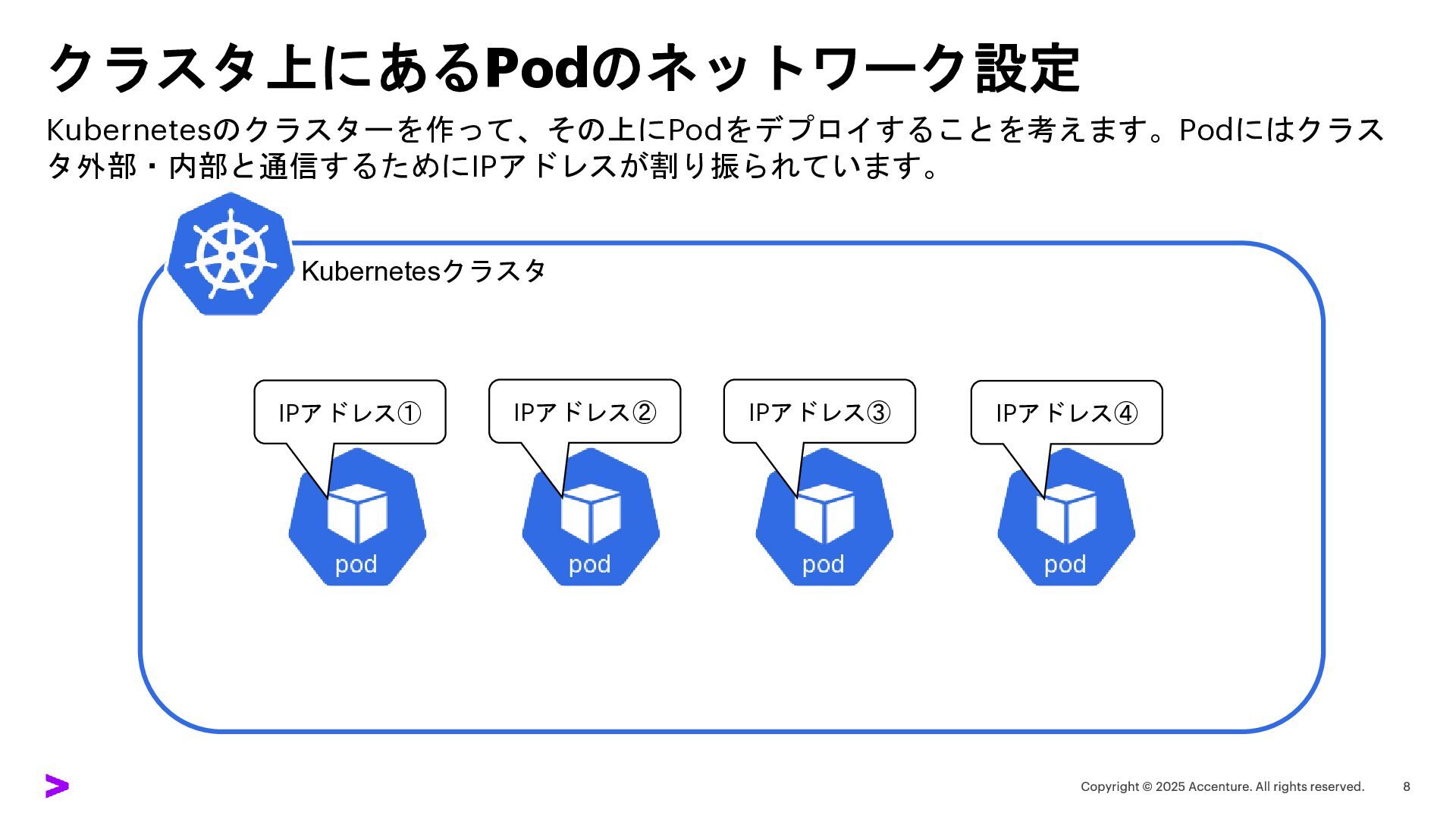 クラスタ上にあるPodのネットワーク設定 Kubernetesのクラスターを作って、その上にPodをデプロイすることを考えます。Podにはクラス タ外部・内部と通信するためにIPアドレスが割り振られています。 Kubernetesクラスタ IPアドレス① IPアドレス② IPアドレス③ IPアドレス④