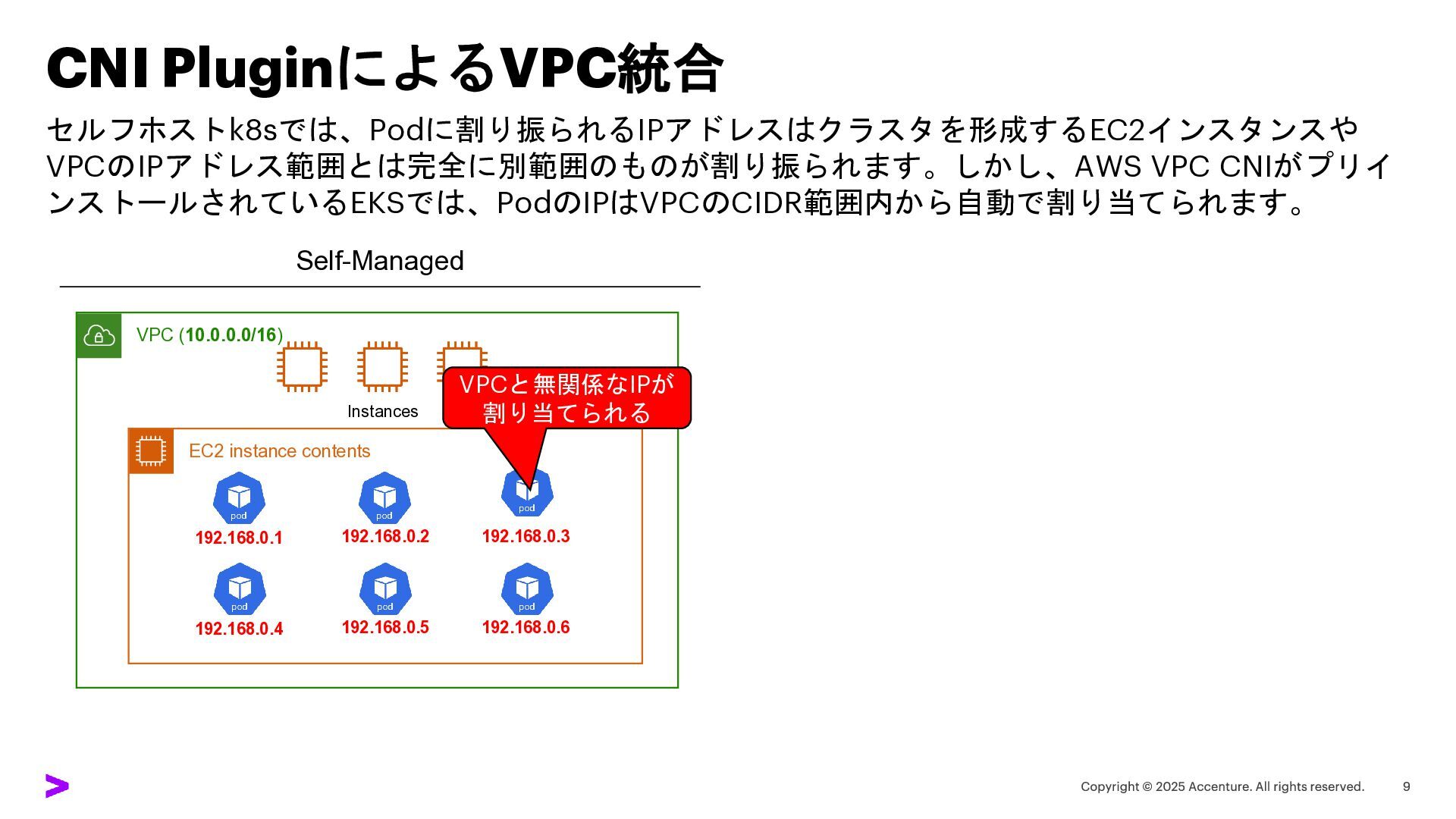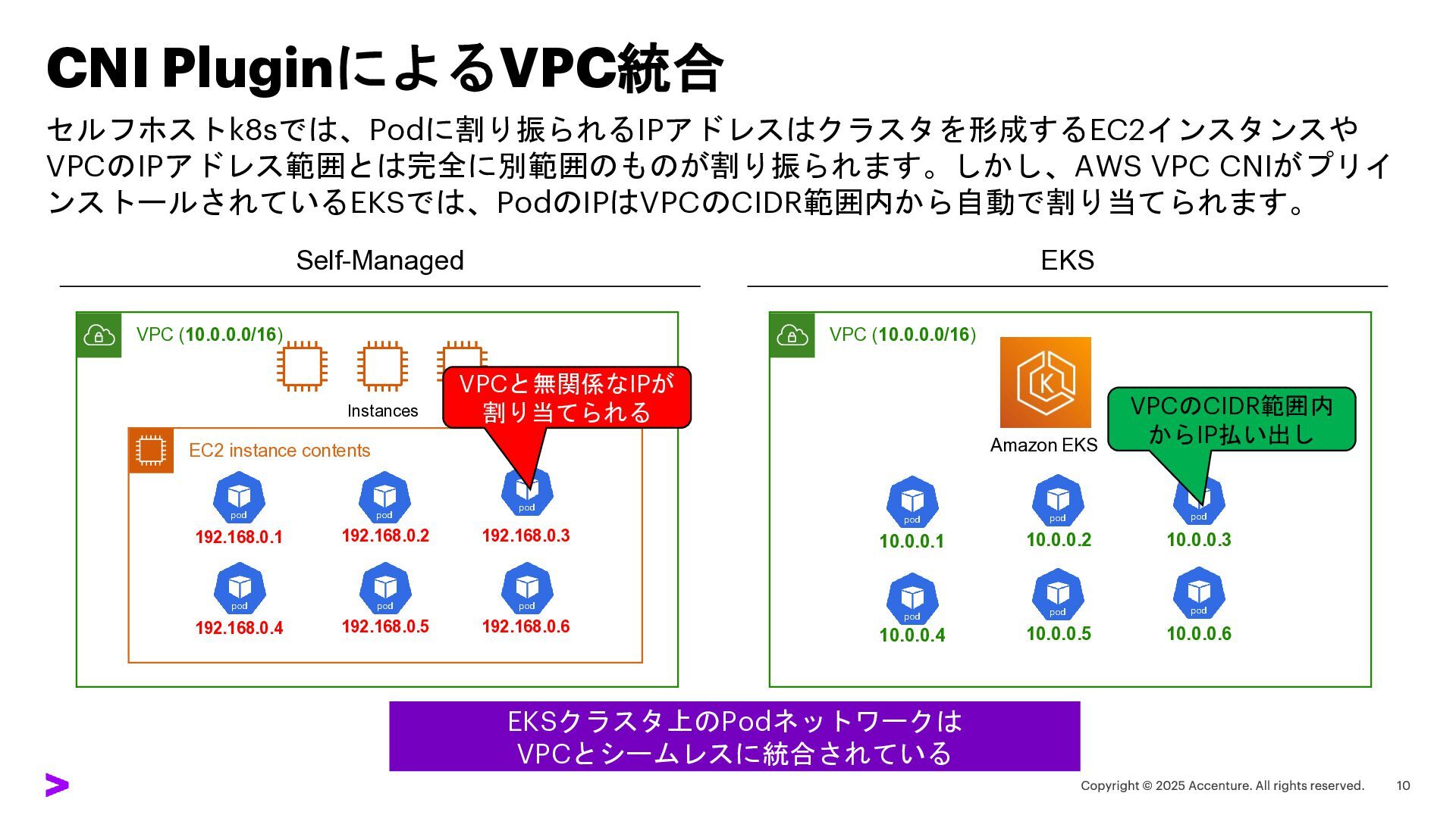 CNI PluginによるVPC統合 セルフホストk8sでは、Podに割り振られるIPアドレスはクラスタを形成するEC2インスタンスや VPCのIPアドレス範囲とは完全に別範囲のものが割り振られます。しかし、AWS VPC CNIがプリイ ンストールされているEKSでは、PodのIPはVPCのCIDR範囲内から自動で割り当てられます。 Self-Managed VPC (10.0.0.0/16)