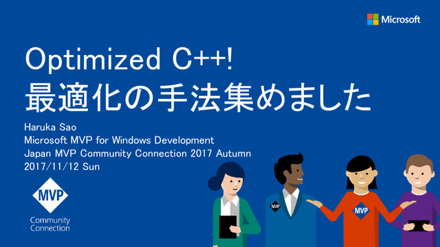 Japan MVP Community Connection 2017 Autumn Optimized C++! 最適化の手法集めました 遥佐保 PPTX→http://jyurimaru.info/data/20171112MVPCommunityConnection_OptimizedCpp/20171112_Optimized_cpp_public.pptx