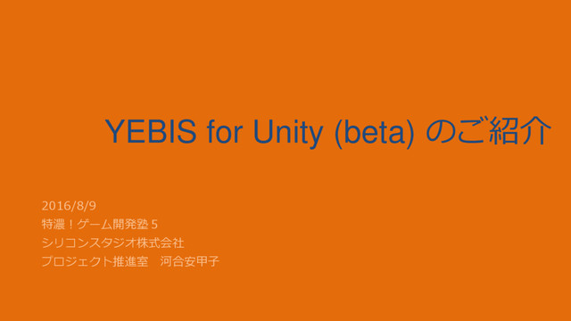 YEBIS for Unity (beta) のご紹介 2016/8/9 特濃!ゲーム開発塾5 シリコンスタジオ株式会社 プロジェクト推進室 河合安甲子