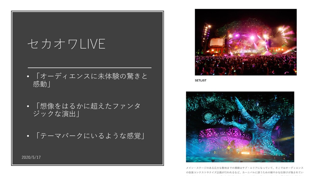 セカオワLIVE • 「オーディエンスに未体験の驚きと 感動」 • 「想像をはるかに超えたファンタ ジックな演出」 • 「テーマパークにいるような感覚」 2020/5/17