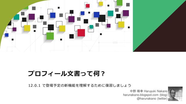 プロフィール文書って何? 12.0.1 で登場予定の新機能を理解するために復習しましょう 中野 晴幸 Haruyuki Nakano harunakano.blogspot.com (blog) @harunakano