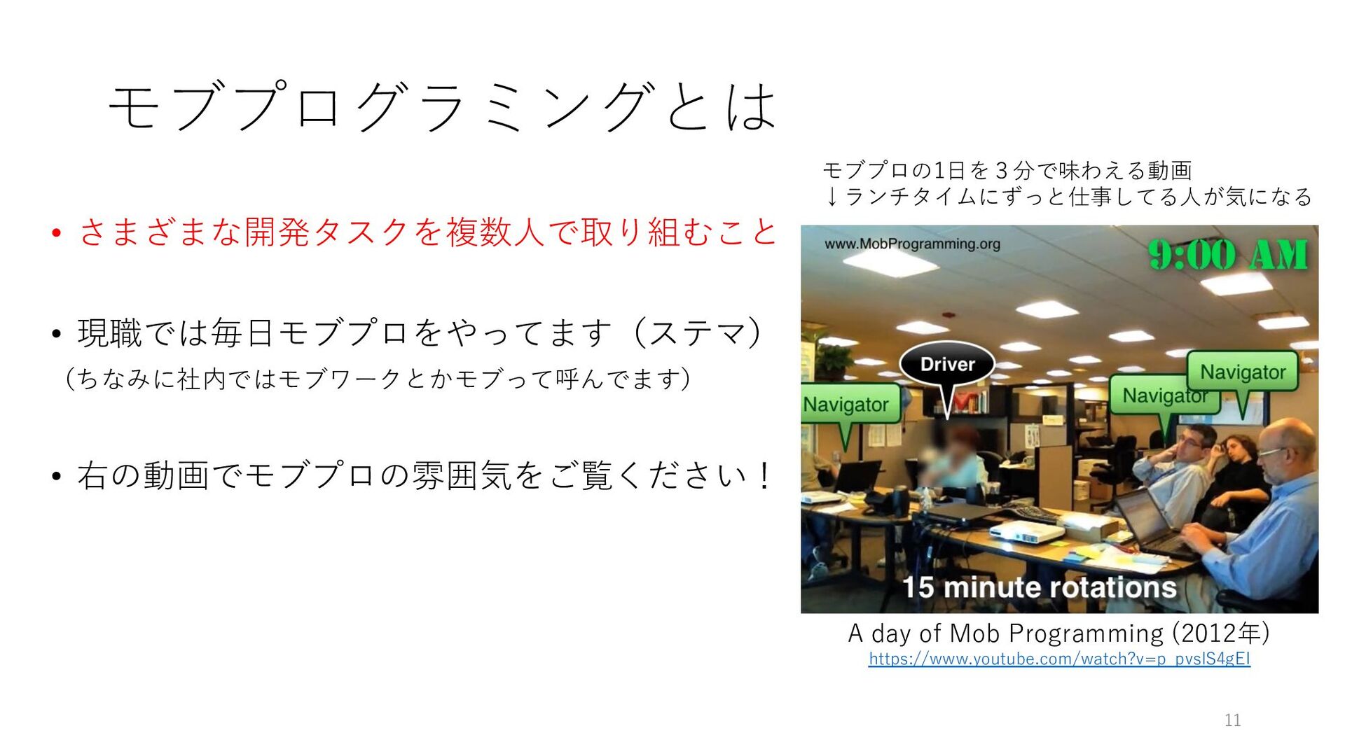 day of Mob Programming (2012年) https://www.youtube.com/watch?v=p_pvslS4gEI モブプロの1⽇を3分で味わえる動画 ↓ランチタイムにずっと仕事してる⼈が気になる
