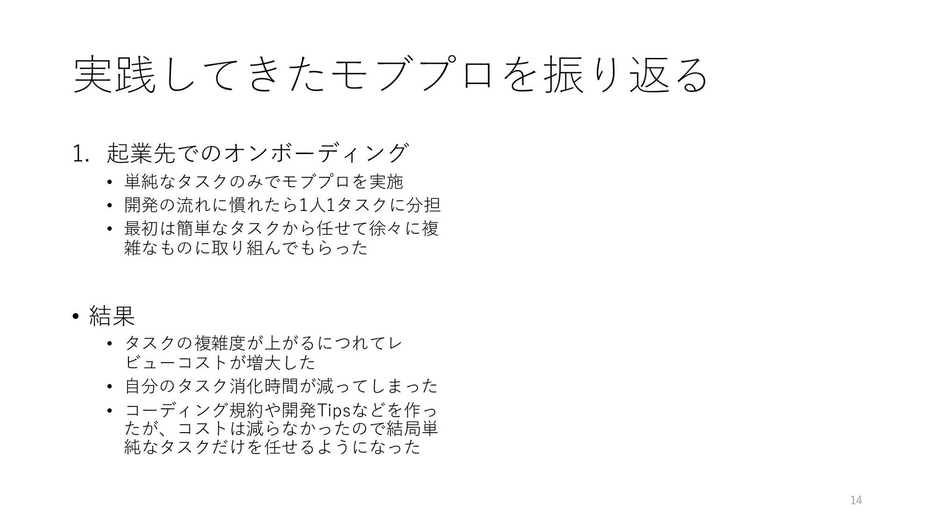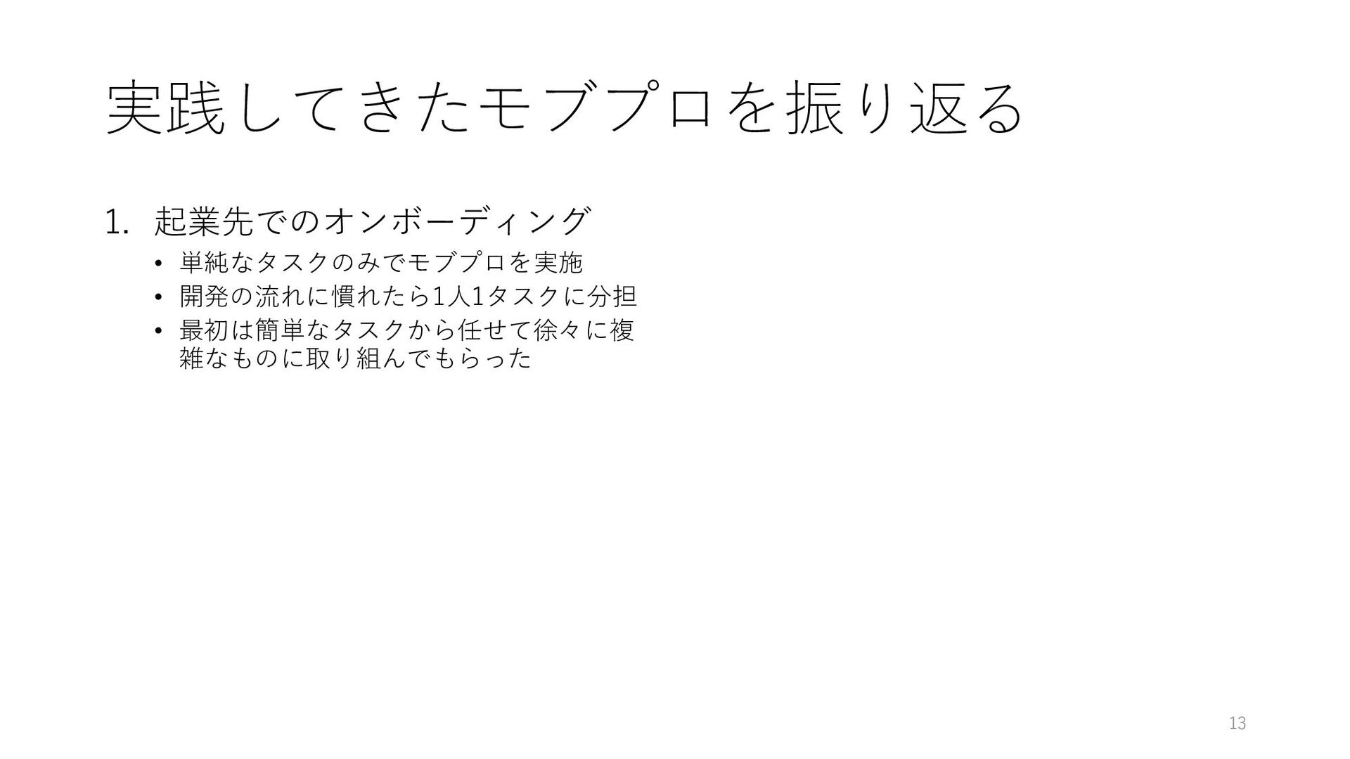 実践してきたモブプロを振り返る 1. 起業先でのオンボーディング • 単純なタスクのみでモブプロを実施 • 開発の流れに慣れたら1⼈1タスクに分担 • 最初は簡単なタスクから任せて徐々に複 雑なものに取り組んでもらった