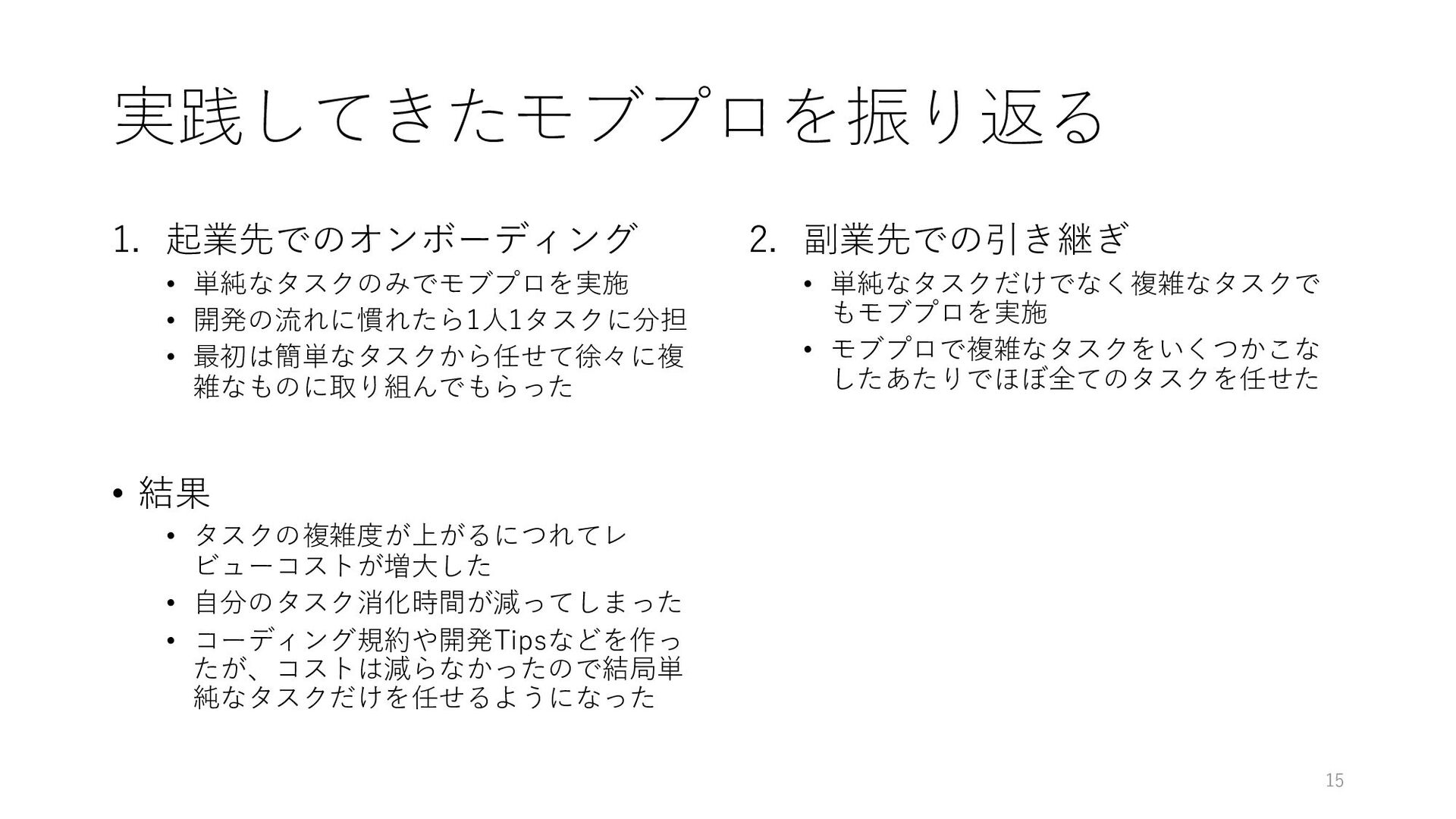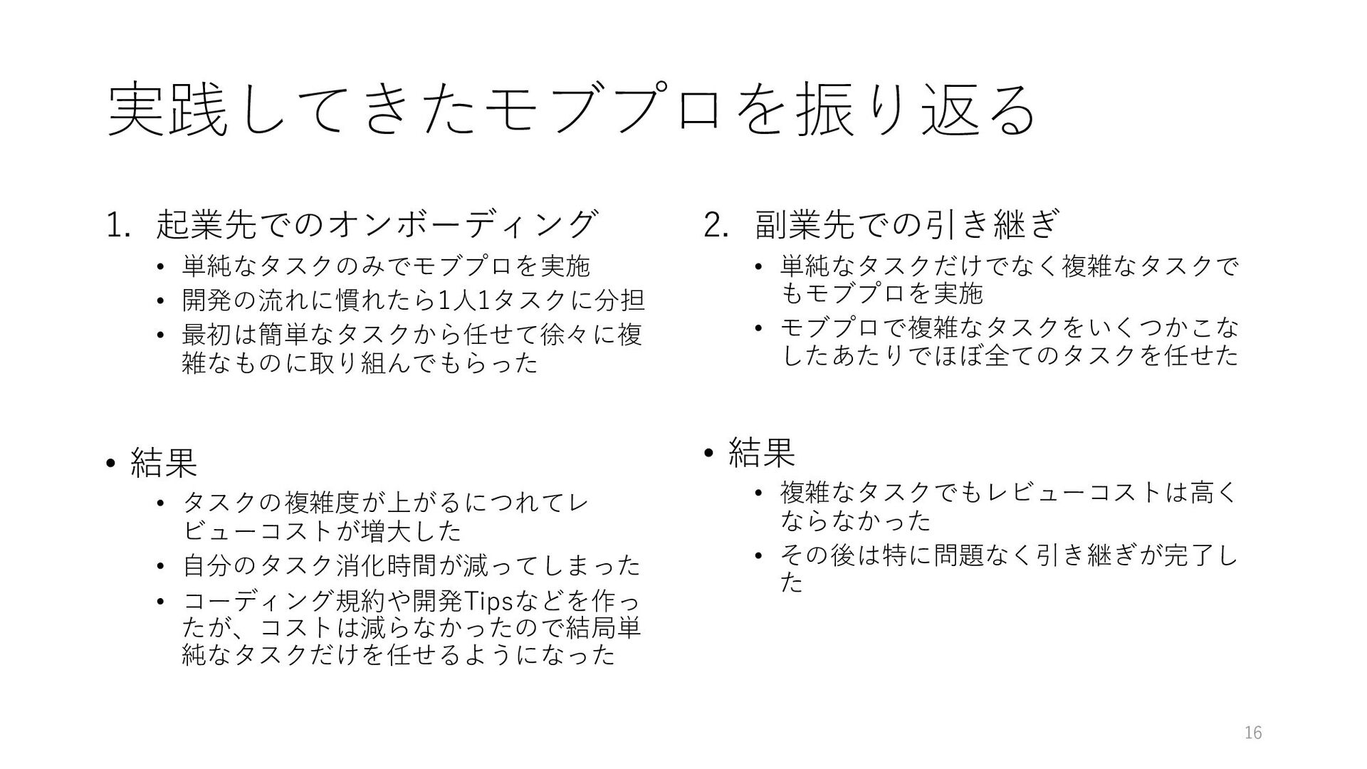 • 結果 • タスクの複雑度が上がるにつれてレ ビューコストが増⼤した • ⾃分のタスク消化時間が減ってしまった • コーディング規約や開発Tipsなどを作っ たが、コストは減らなかったので結局単 純なタスクだけを任せるようになった 2. 副業先での引き継ぎ • 単純なタスクだけでなく複雑なタスクで もモブプロを実施 • モブプロで複雑なタスクをいくつかこな したあたりでほぼ全てのタスクを任せた 15