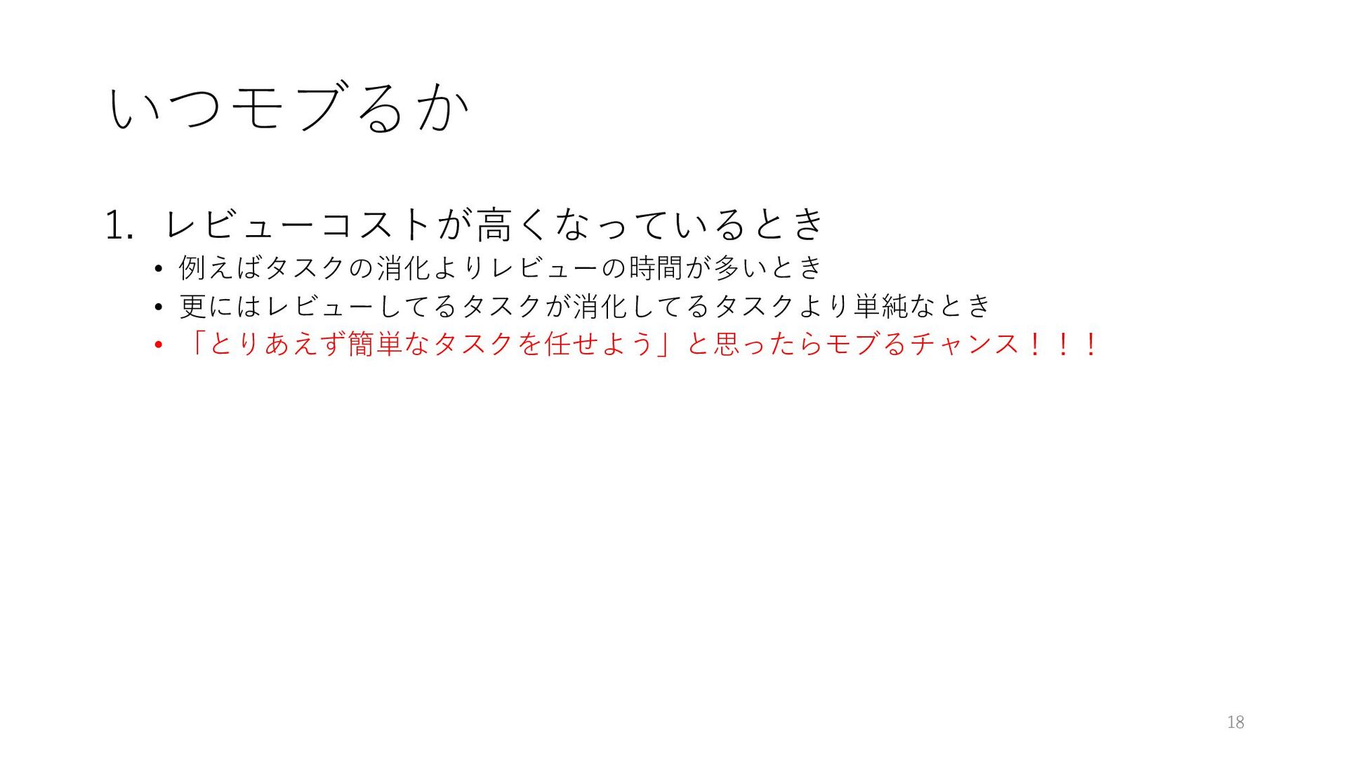 いつモブるか 1. レビューコストが⾼くなっているとき • 例えばタスクの消化よりレビューの時間が多いとき • 更にはレビューしてるタスクが消化してるタスクより単純なとき • 「とりあえず簡単なタスクを任せよう」と思ったらモブるチャンス!!! 2.