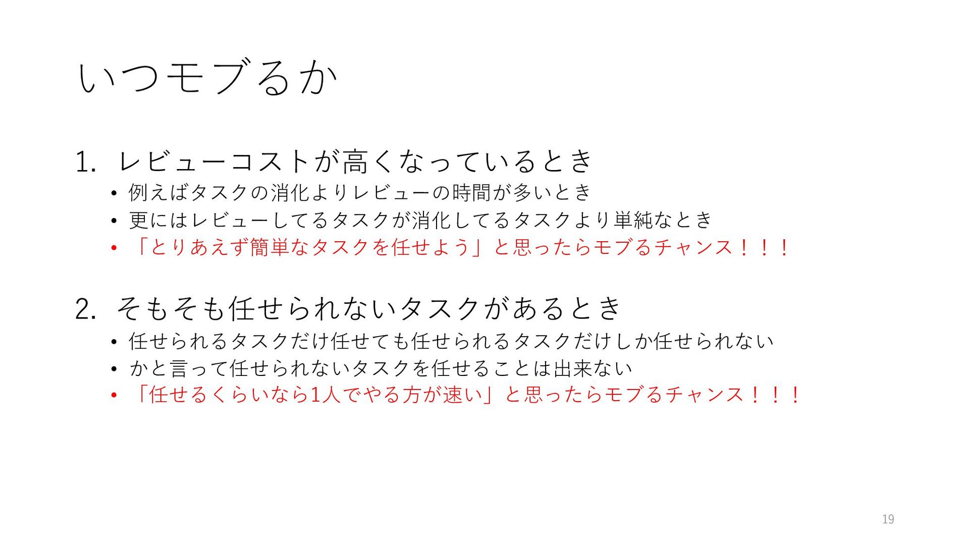 いつモブるか 1. レビューコストが⾼くなっているとき • 例えばタスクの消化よりレビューの時間が多いとき • 更にはレビューしてるタスクが消化してるタスクより単純なとき • 「とりあえず簡単なタスクを任せよう」と思ったらモブるチャンス!!! 18