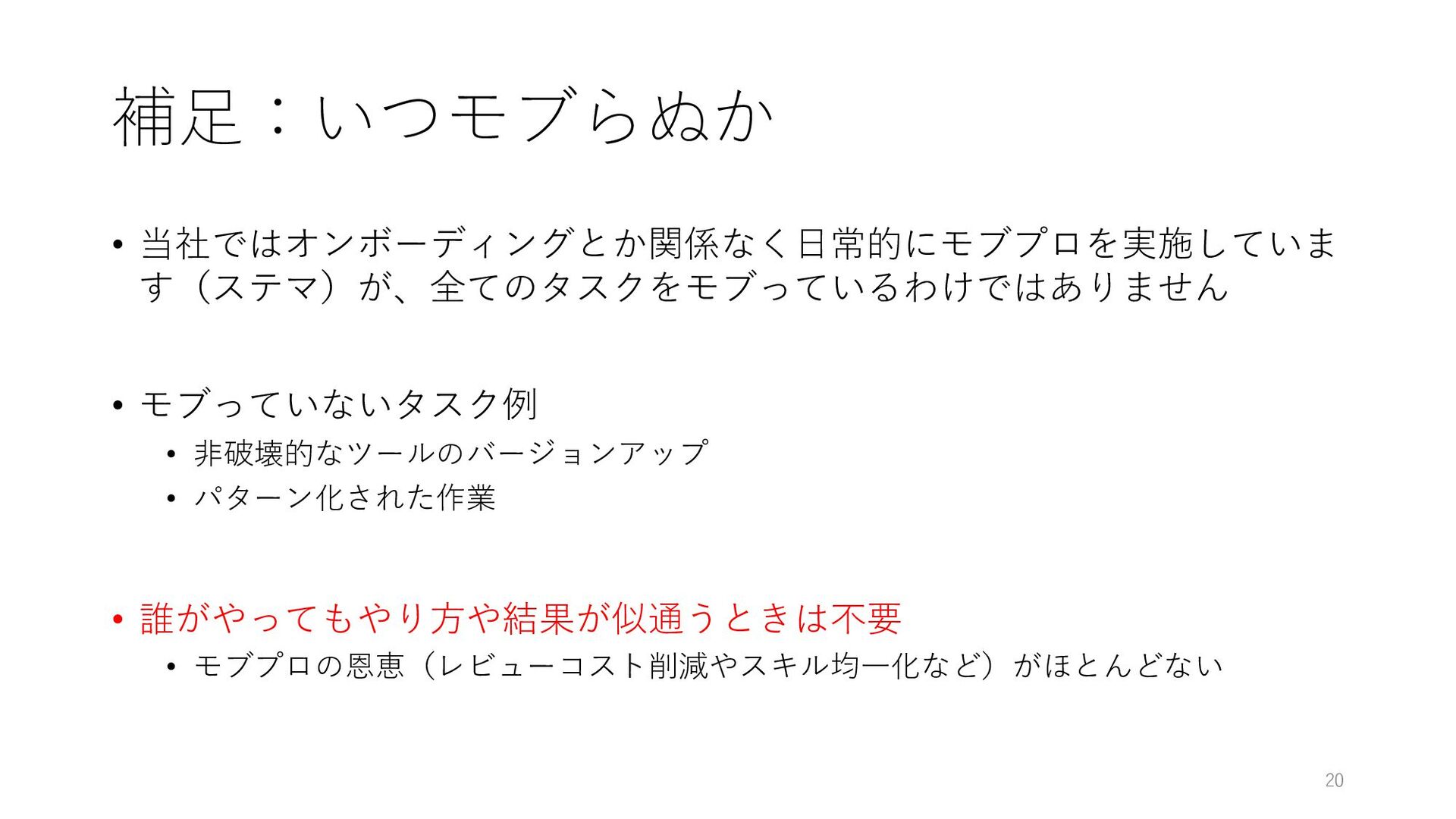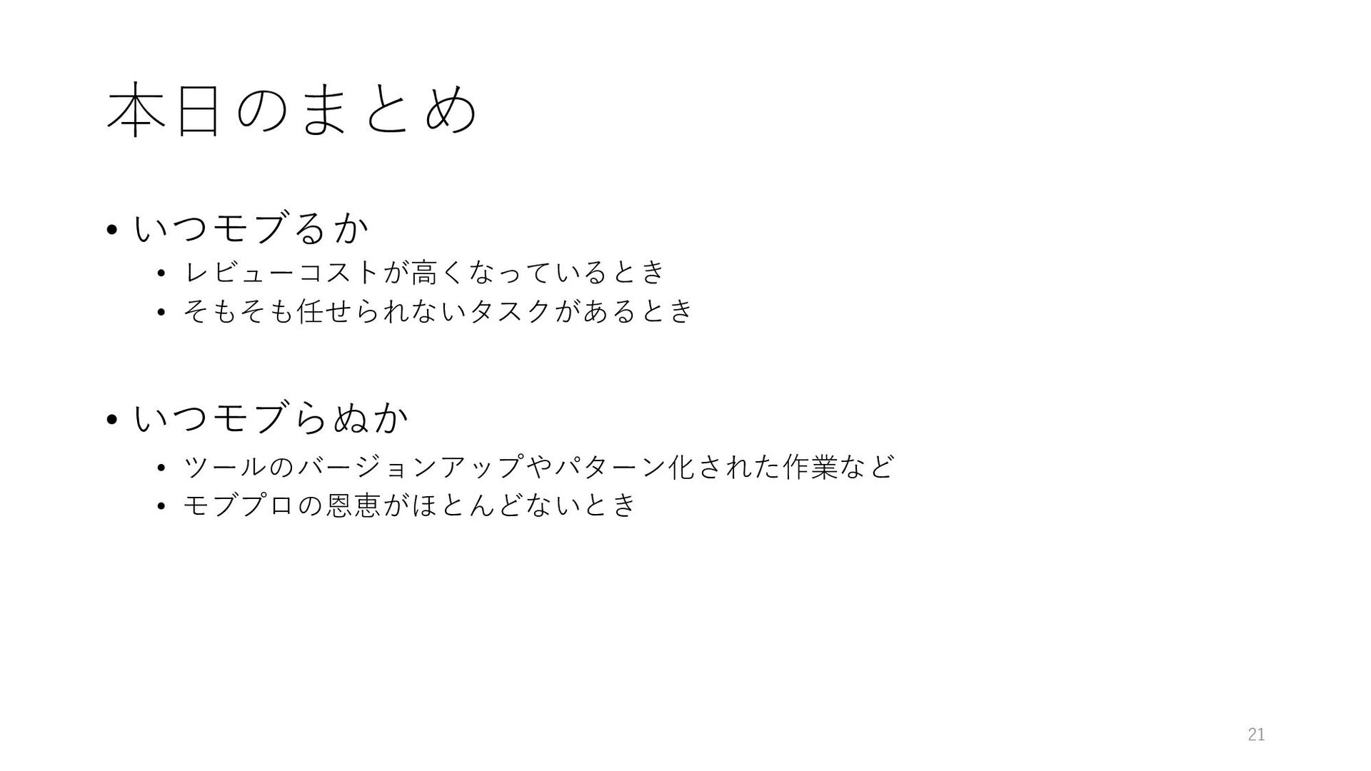 • 誰がやってもやり⽅や結果が似通うときは不要 • モブプロの恩恵(レビューコスト削減やスキル均⼀化など)がほとんどない 20