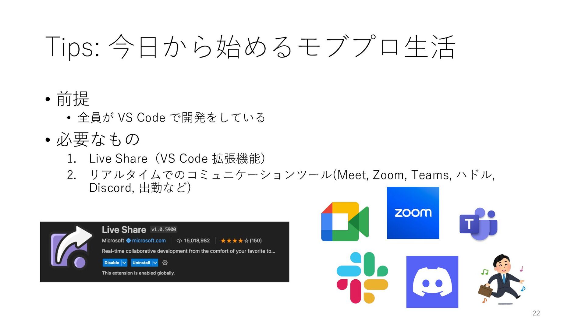 必要なもの 1. Live Share(VS Code 拡張機能) 2. リアルタイムでのコミュニケーションツール(Meet, Zoom, Teams, ハドル, Discord, 出勤など) 22
