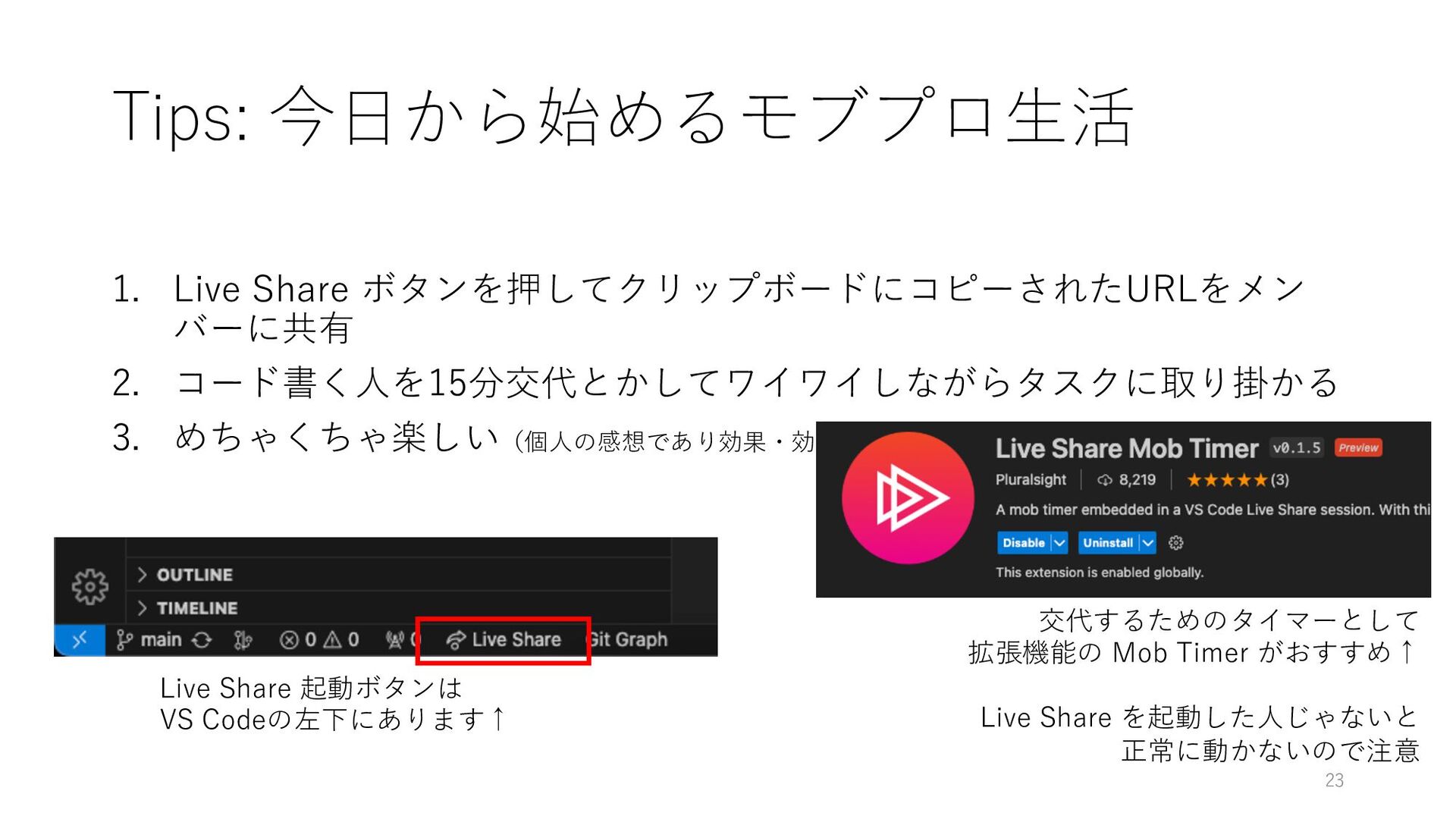 めちゃくちゃ楽しい(個⼈の感想であり効果・効能を⽰すものではありません) 23 交代するためのタイマーとして 拡張機能の Mob Timer がおすすめ↑ Live Share を起動した⼈じゃないと 正常に動かないので注意 Live Share 起動ボタンは VS Codeの左下にあります↑