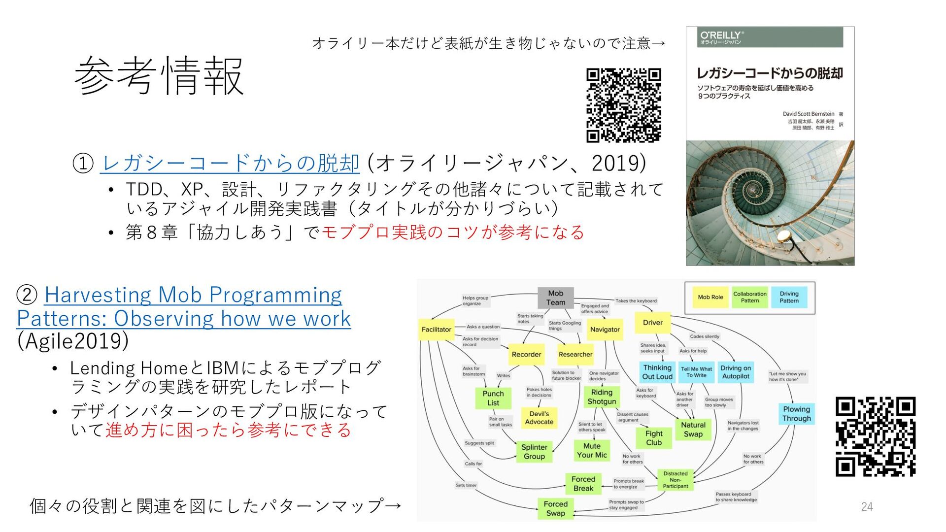 ② Harvesting Mob Programming Patterns: Observing how we work (Agile2019) • Lending HomeとIBMによるモブプログ ラミングの実践を研究したレポート • デザインパターンのモブプロ版になって いて進め⽅に困ったら参考にできる 個々の役割と関連を図にしたパターンマップ→ オライリー本だけど表紙が⽣き物じゃないので注意→