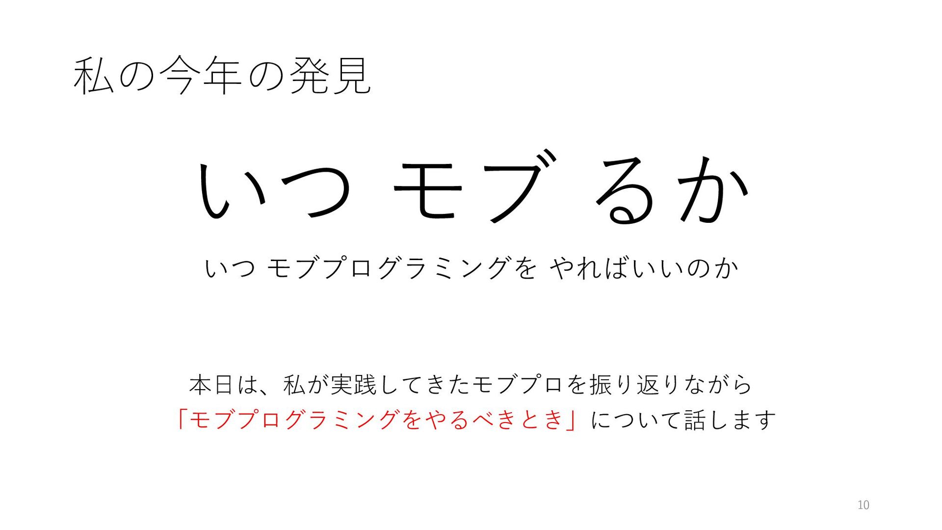 私の今年の発⾒ いつ モブ るか いつ モブプログラミングを やればいいのか 本⽇は、私が実践してきたモブプロを振り返りながら 「モブプログラミングをやるべきとき」について話します 10
