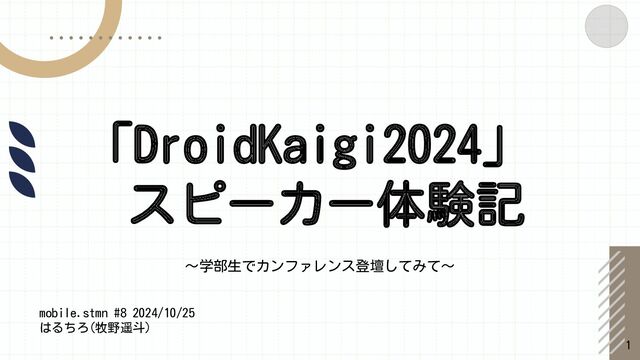 「DroidKaigi2024」 スピーカー体験記 〜学部生でカンファレンス登壇してみて〜 mobile.stmn #8 2024/10/25 はるちろ(牧野遥斗) 1