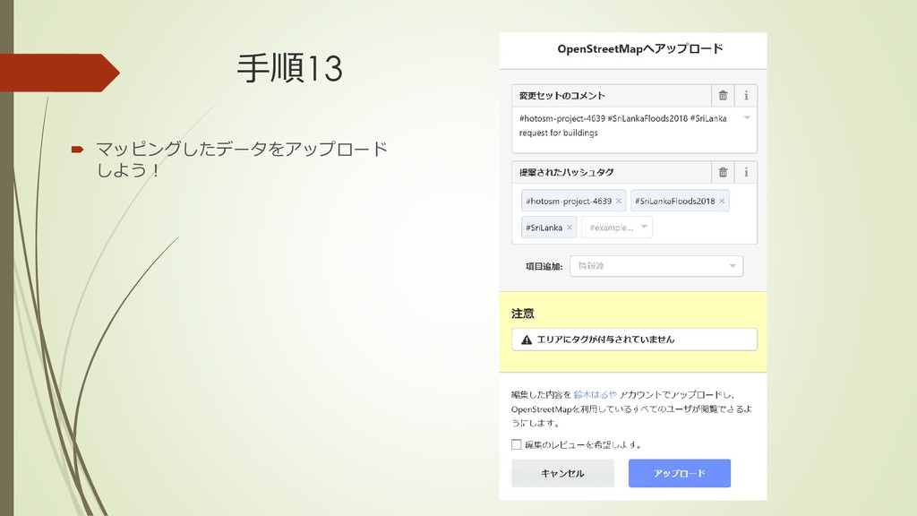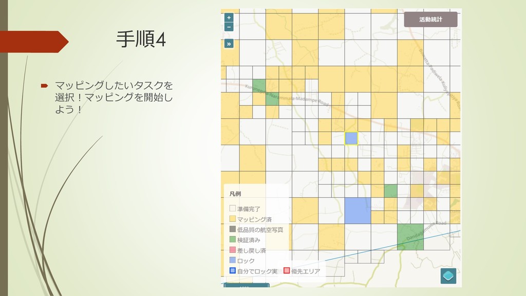 手順14 マップ内のすべてのマッピングが 完了したら、tasking managerで それを報告しよう! マッピング完了としてマーク!