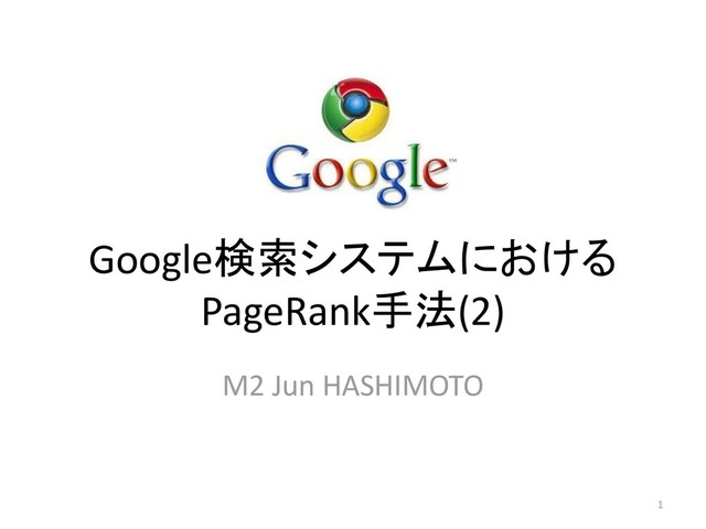 Google検索システムにおける PageRank手法(2) M2 Jun HASHIMOTO 1
