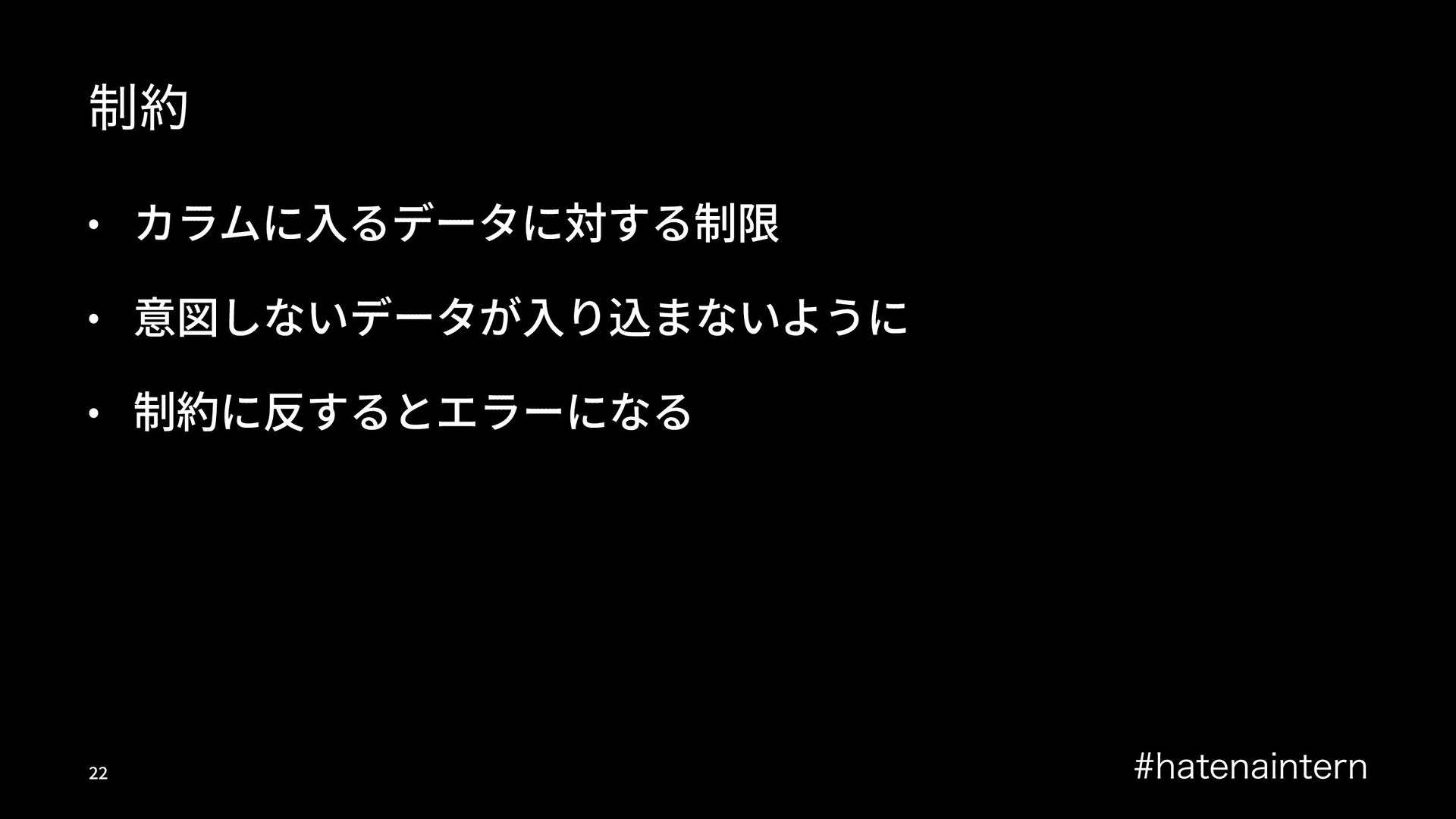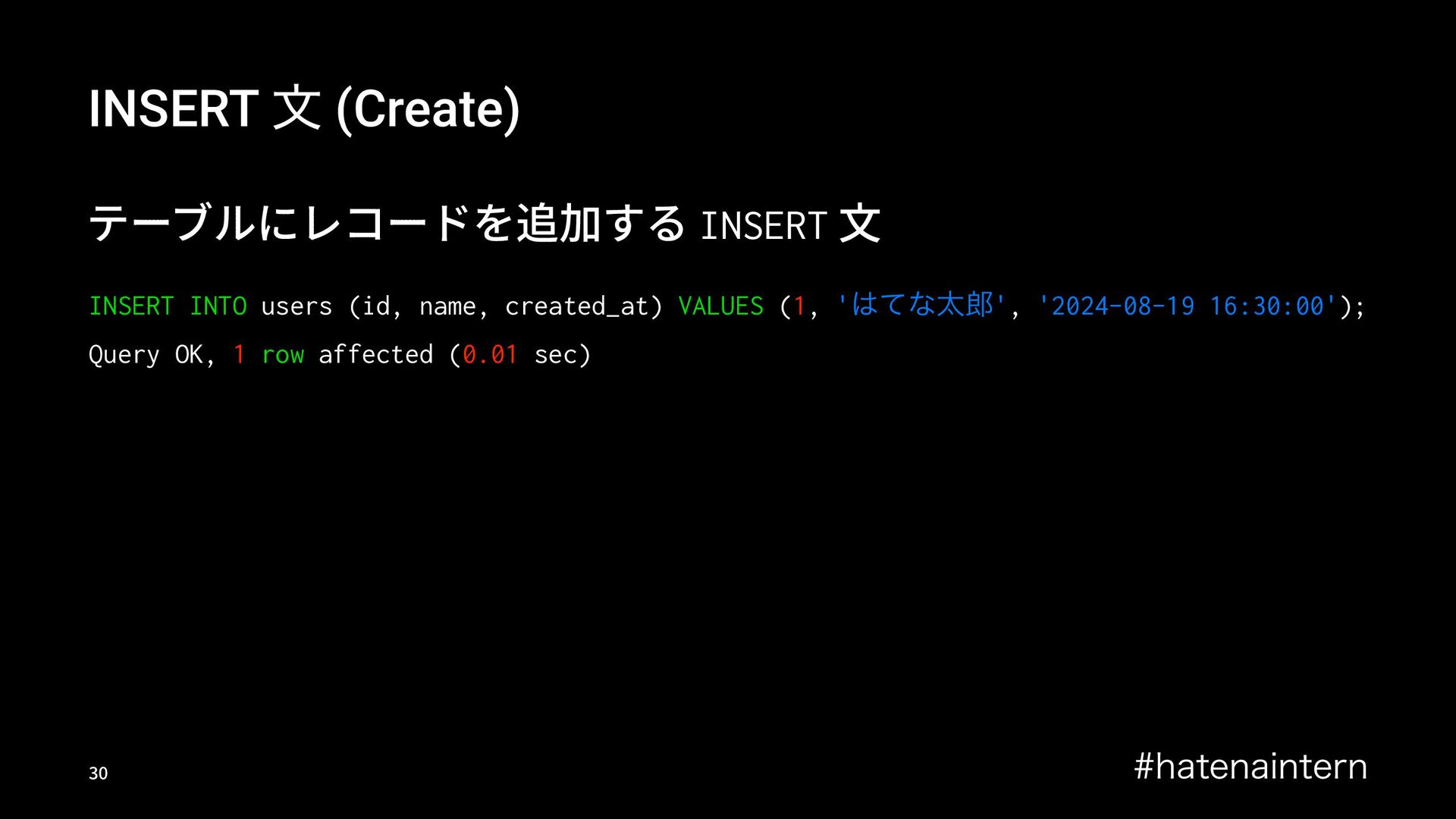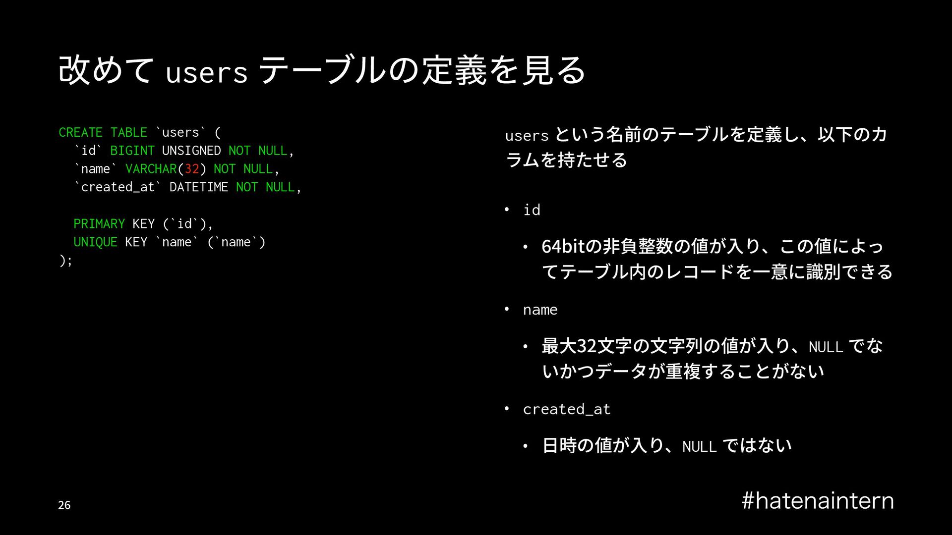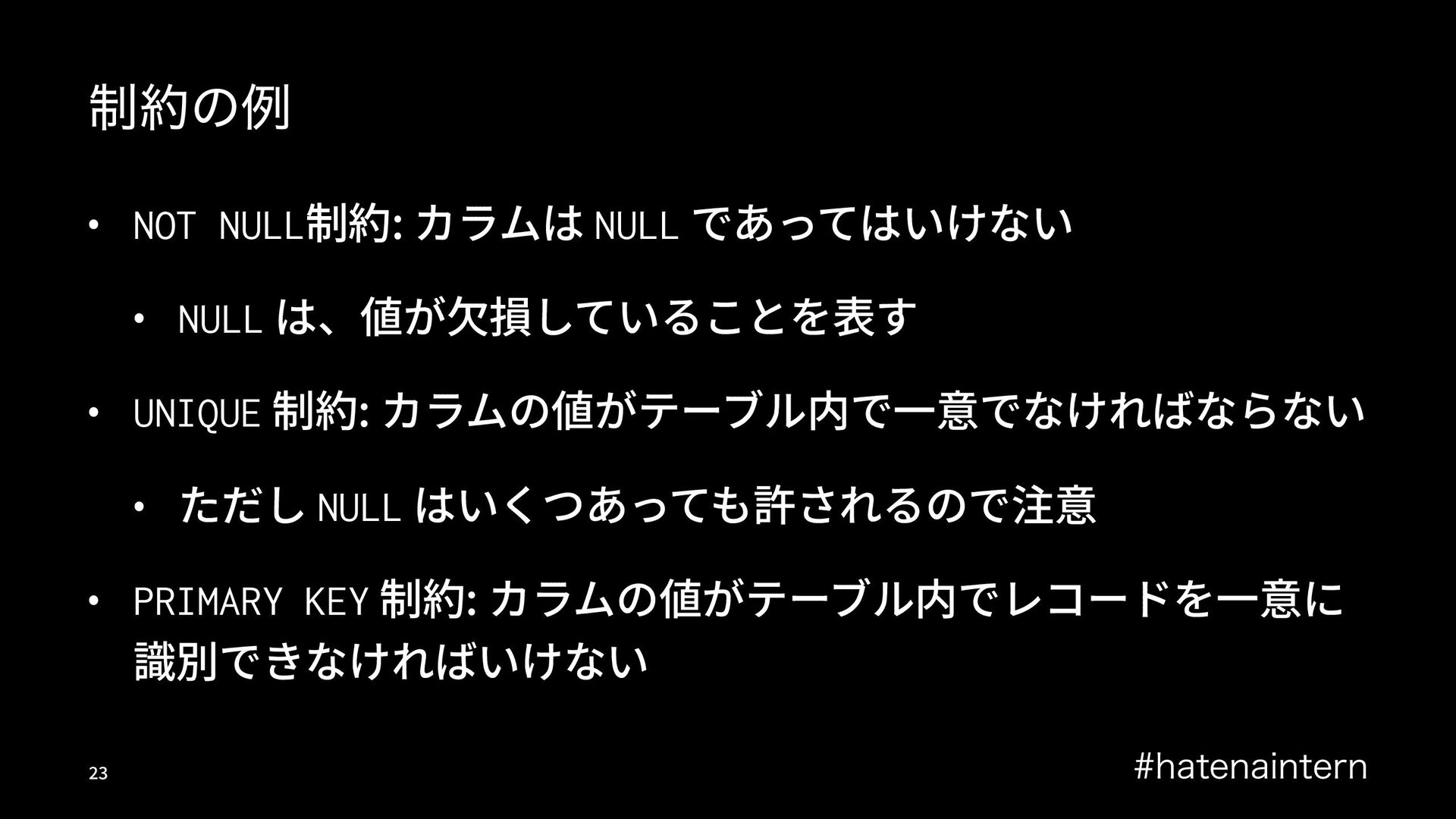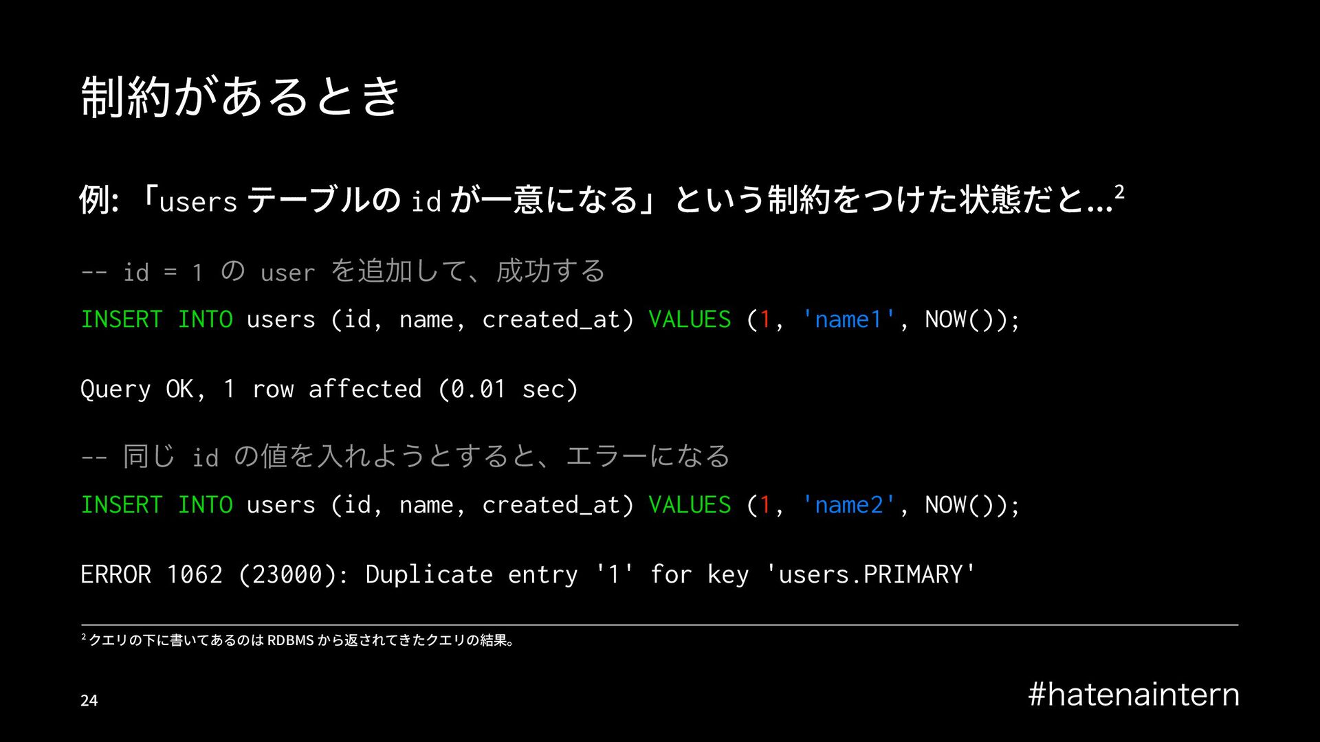 ͷ user ΛՃͯ͠ɺޭ͢Δ INSERT INTO users (id, name, created_at) VALUES (1, 'name1', NOW()); Query OK, 1 row affected (0.01 sec) -- ಉ͡ id ͷΛೖΕΑ͏ͱ͢ΔͱɺΤϥʔʹͳΔ INSERT INTO users (id, name, created_at) VALUES (1, 'name2', NOW()); ERROR 1062 (23000): Duplicate entry '1' for key 'users.PRIMARY' ! クエリの下に書いてあるのは RDBMS から返されてきたクエリの結果。 IBUFOBJOUFSO !"