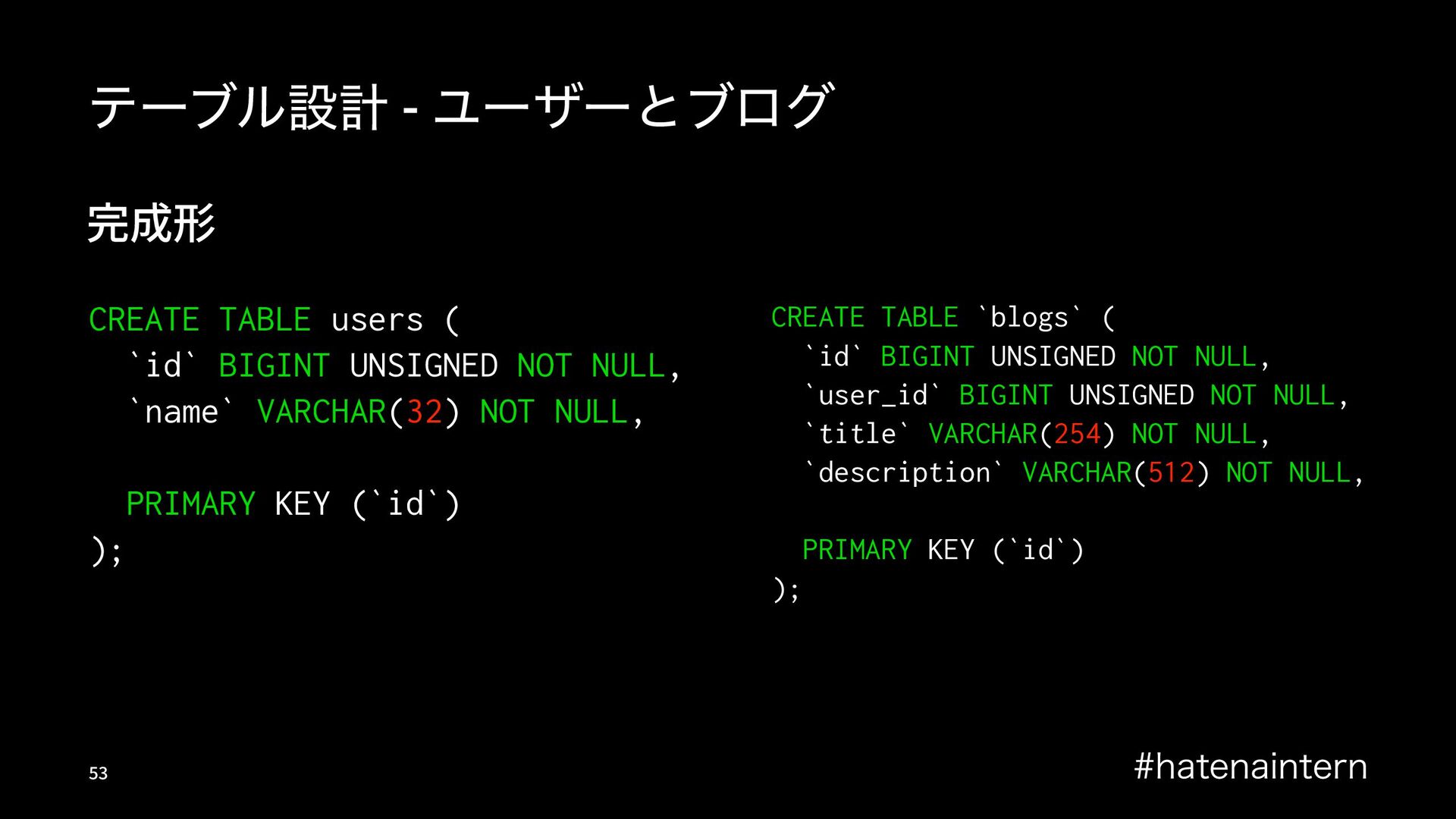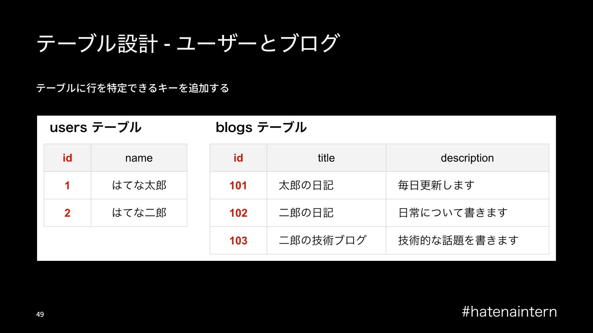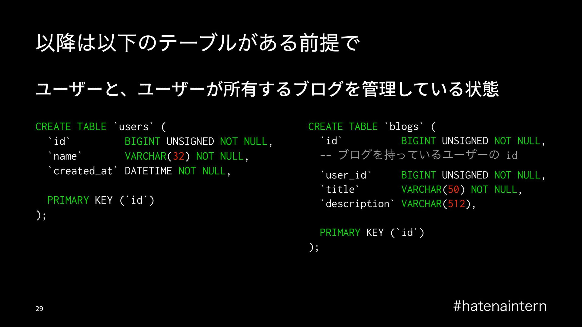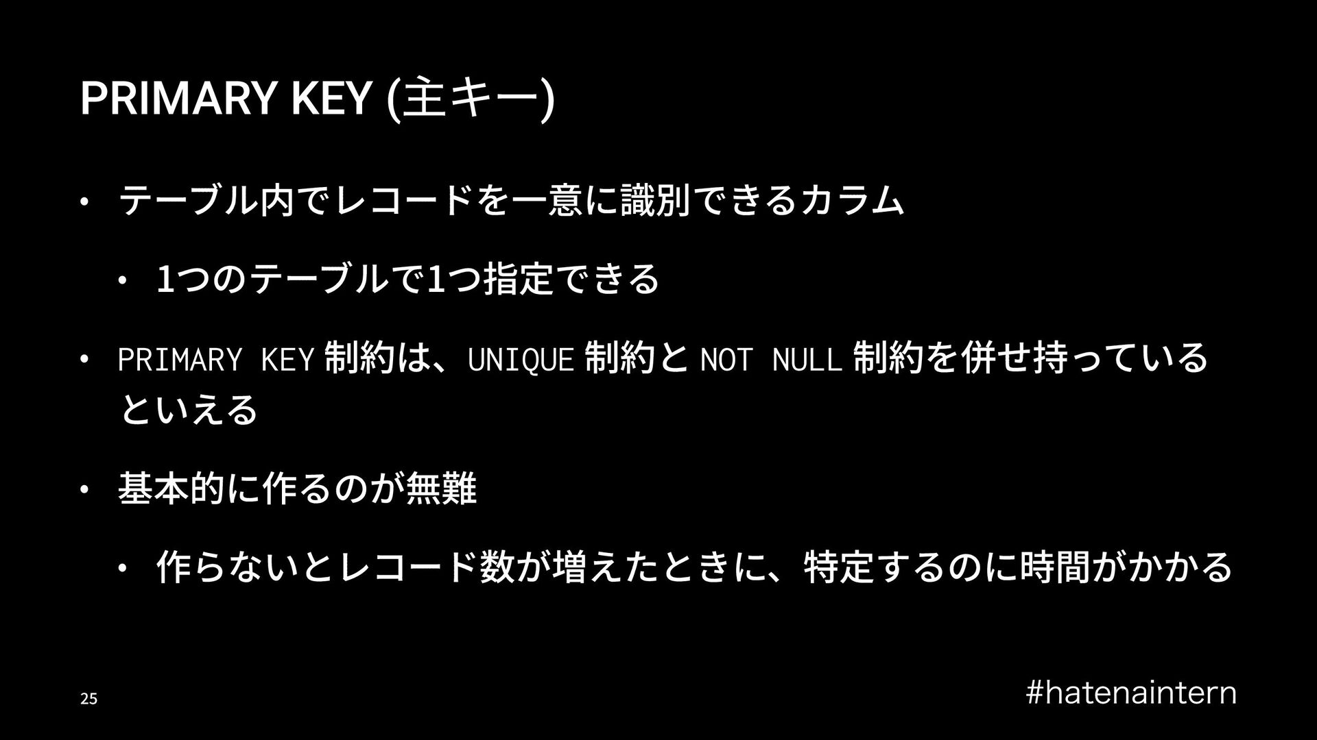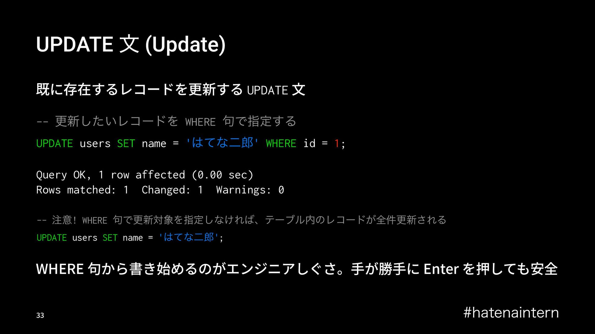 ͷ user ΛՃͯ͠ɺޭ͢Δ INSERT INTO users (id, name, created_at) VALUES (1, 'name1', NOW()); Query OK, 1 row affected (0.01 sec) -- ಉ͡ id ͷΛೖΕΑ͏ͱ͢ΔͱɺΤϥʔʹͳΔ INSERT INTO users (id, name, created_at) VALUES (1, 'name2', NOW()); ERROR 1062 (23000): Duplicate entry '1' for key 'users.PRIMARY' ! クエリの下に書いてあるのは RDBMS から返されてきたクエリの結果。 IBUFOBJOUFSO !"