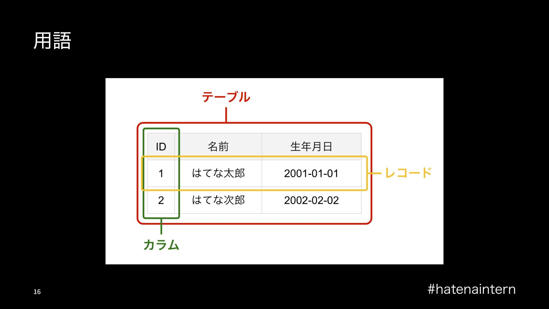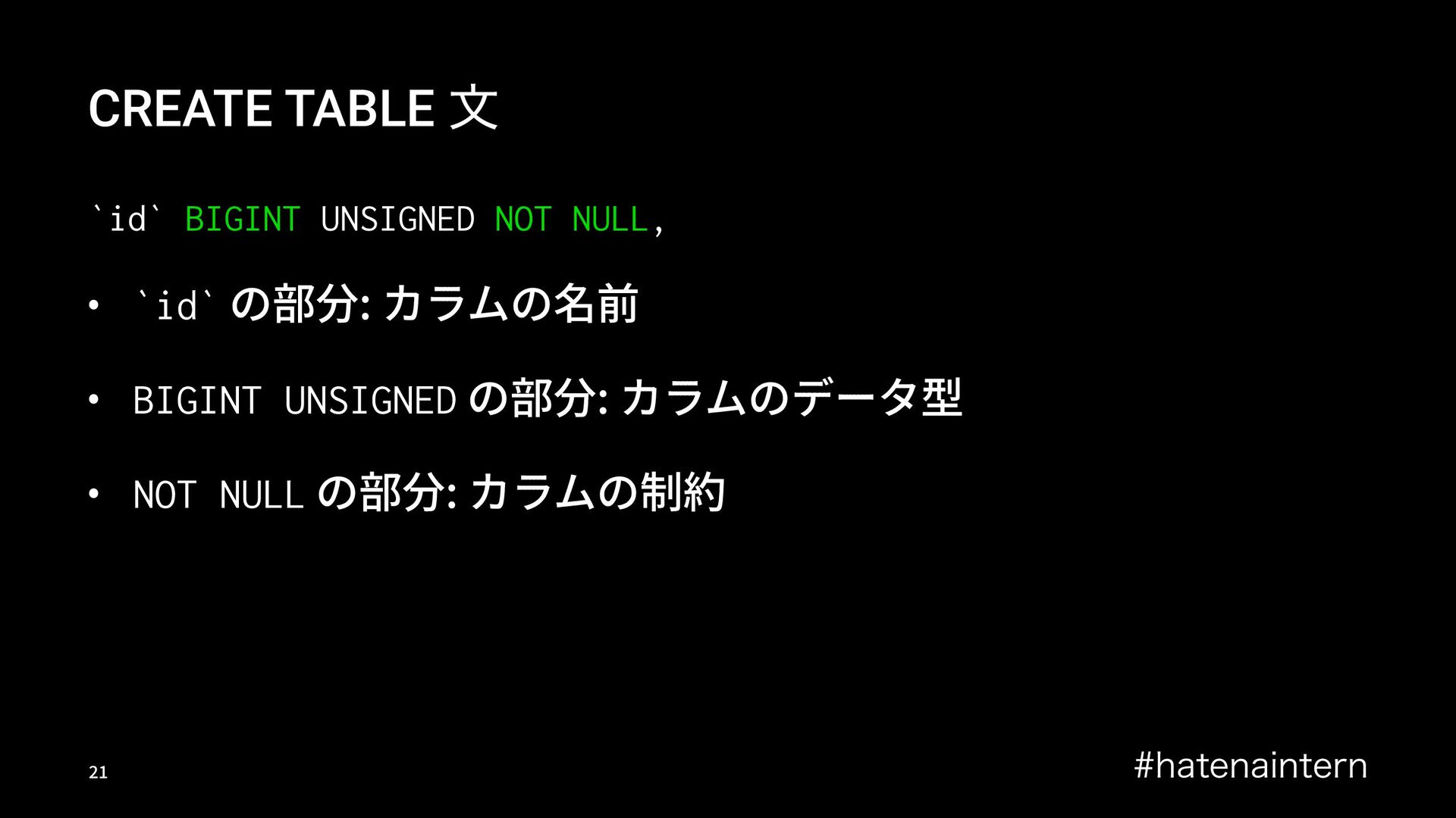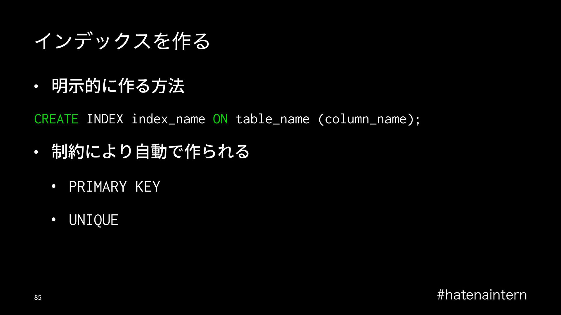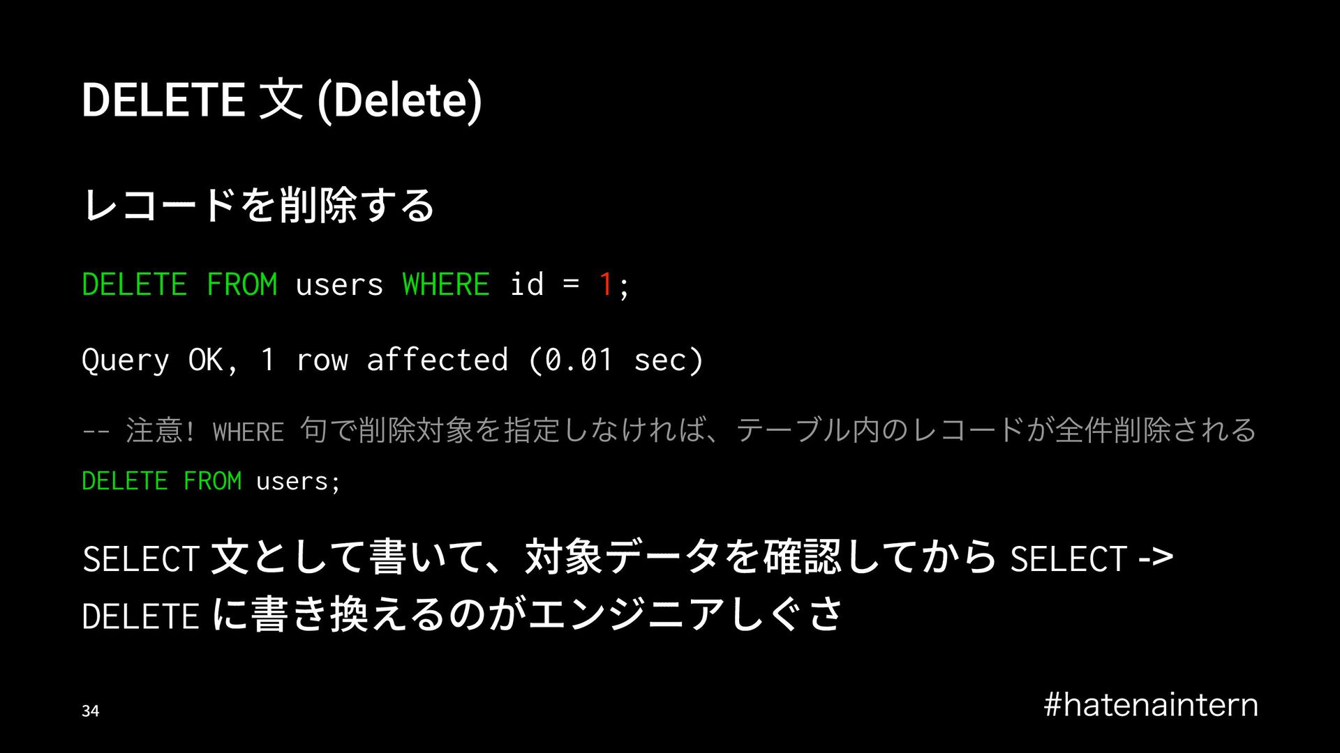 ͷ user ΛՃͯ͠ɺޭ͢Δ INSERT INTO users (id, name, created_at) VALUES (1, 'name1', NOW()); Query OK, 1 row affected (0.01 sec) -- ಉ͡ id ͷΛೖΕΑ͏ͱ͢ΔͱɺΤϥʔʹͳΔ INSERT INTO users (id, name, created_at) VALUES (1, 'name2', NOW()); ERROR 1062 (23000): Duplicate entry '1' for key 'users.PRIMARY' ! クエリの下に書いてあるのは RDBMS から返されてきたクエリの結果。 IBUFOBJOUFSO !"