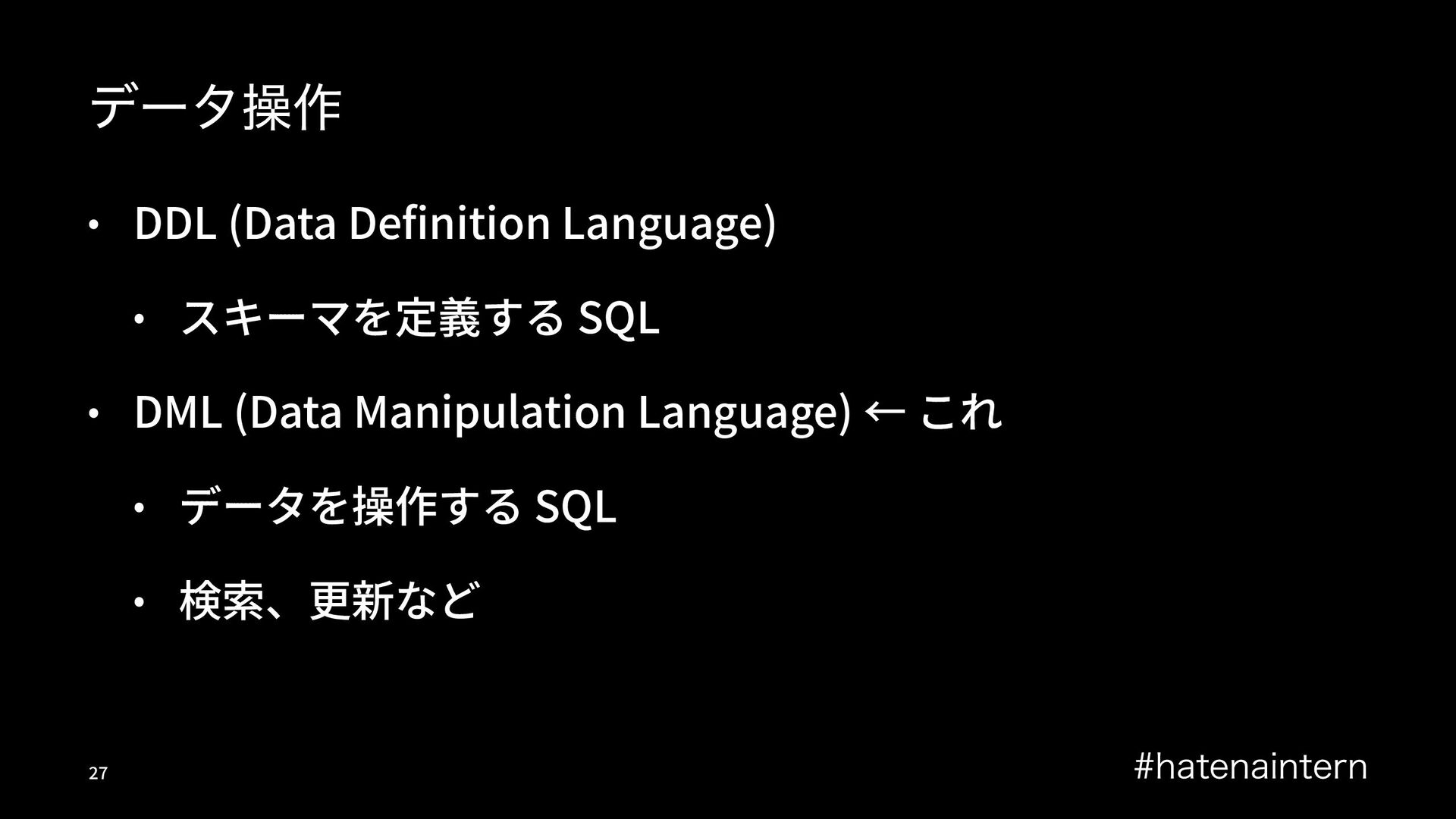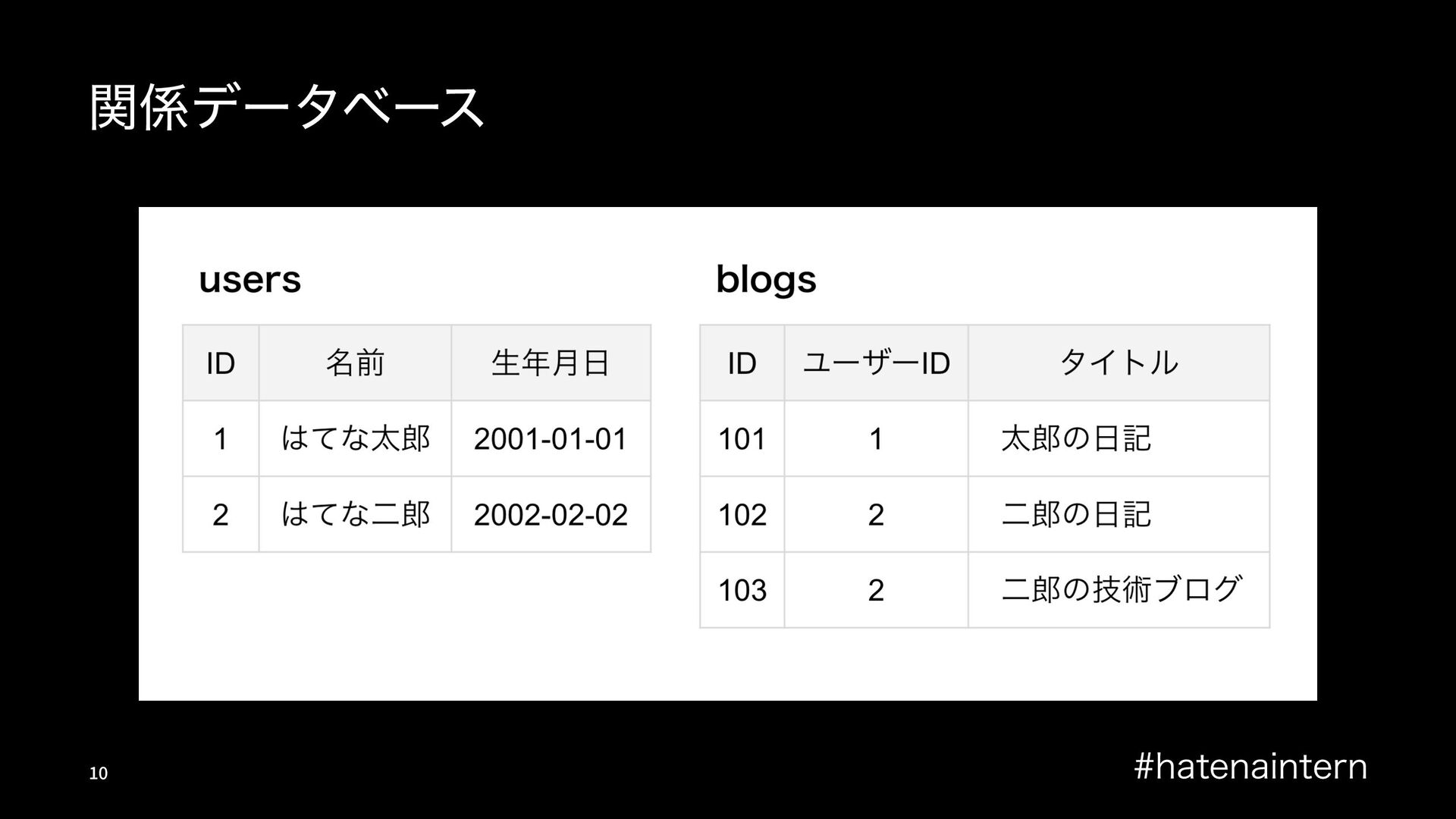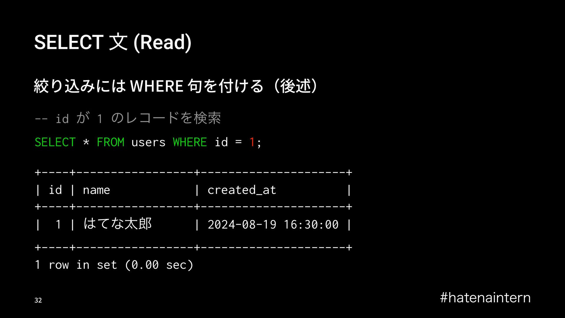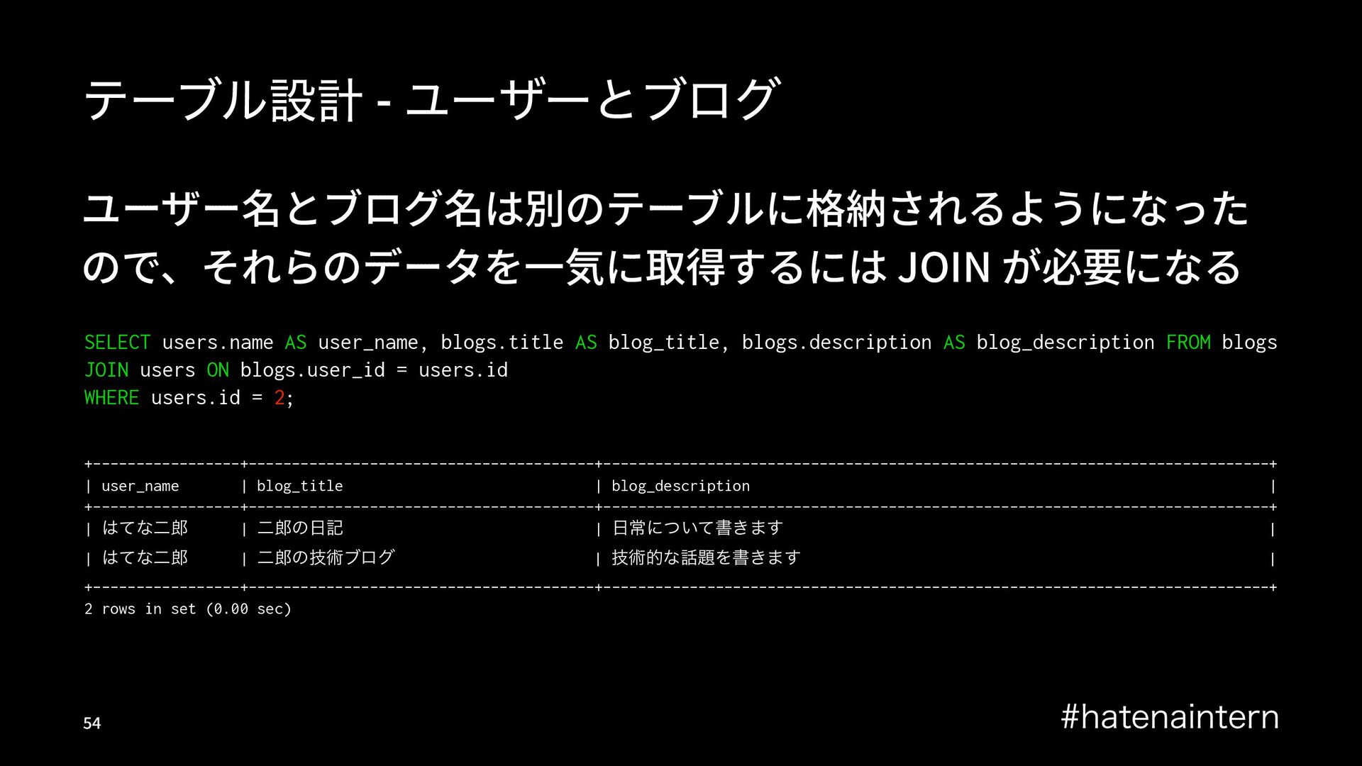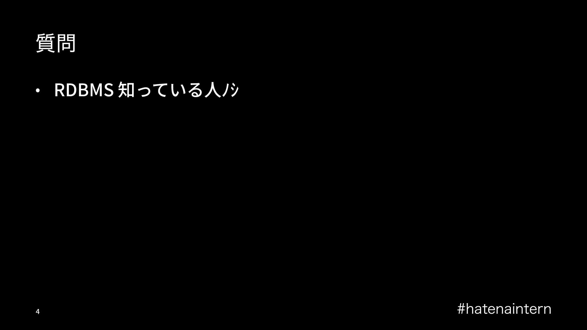 ͷ user ΛՃͯ͠ɺޭ͢Δ INSERT INTO users (id, name, created_at) VALUES (1, 'name1', NOW()); Query OK, 1 row affected (0.01 sec) -- ಉ͡ id ͷΛೖΕΑ͏ͱ͢ΔͱɺΤϥʔʹͳΔ INSERT INTO users (id, name, created_at) VALUES (1, 'name2', NOW()); ERROR 1062 (23000): Duplicate entry '1' for key 'users.PRIMARY' ! クエリの下に書いてあるのは RDBMS から返されてきたクエリの結果。 IBUFOBJOUFSO !"