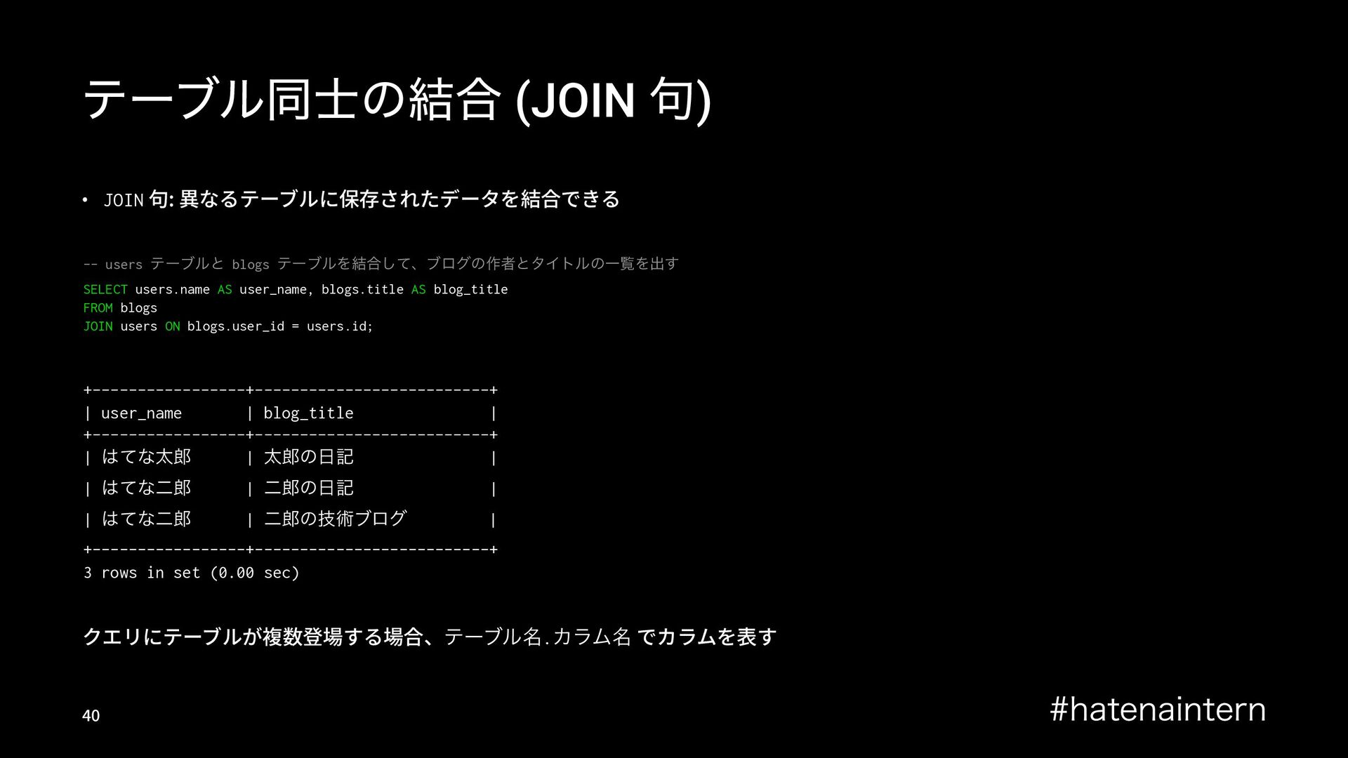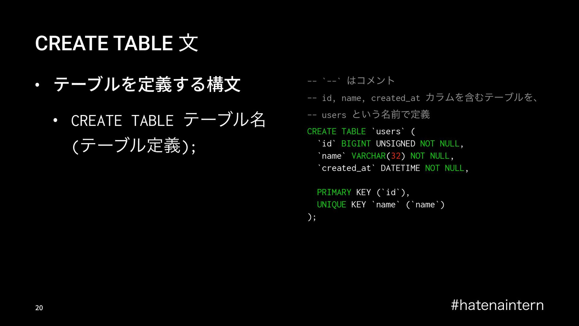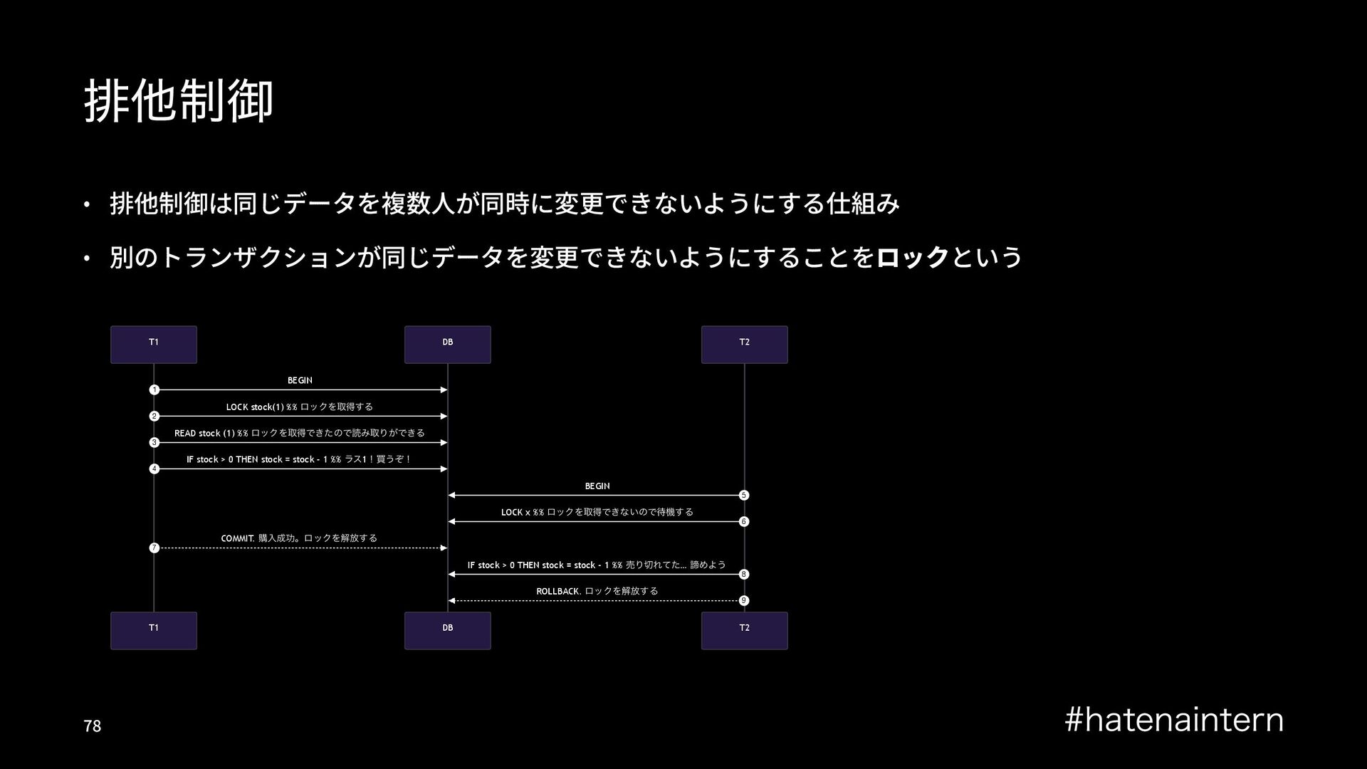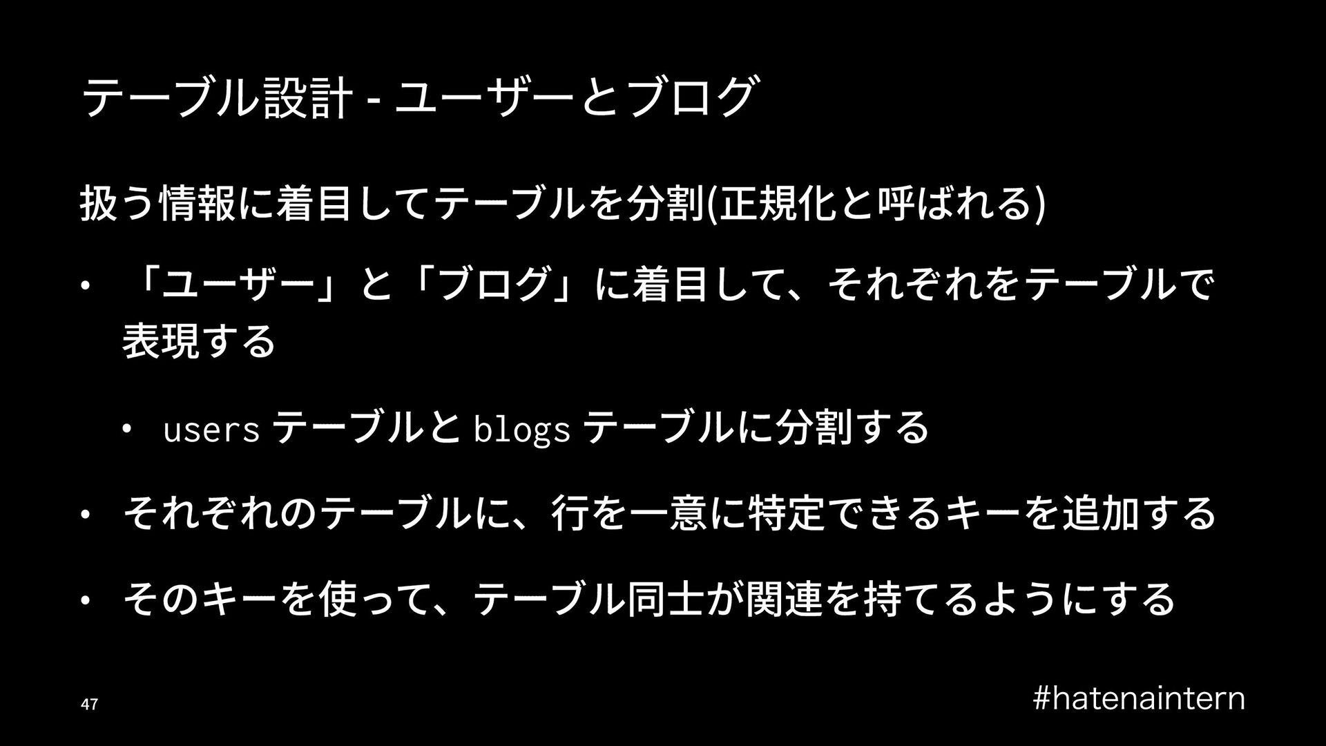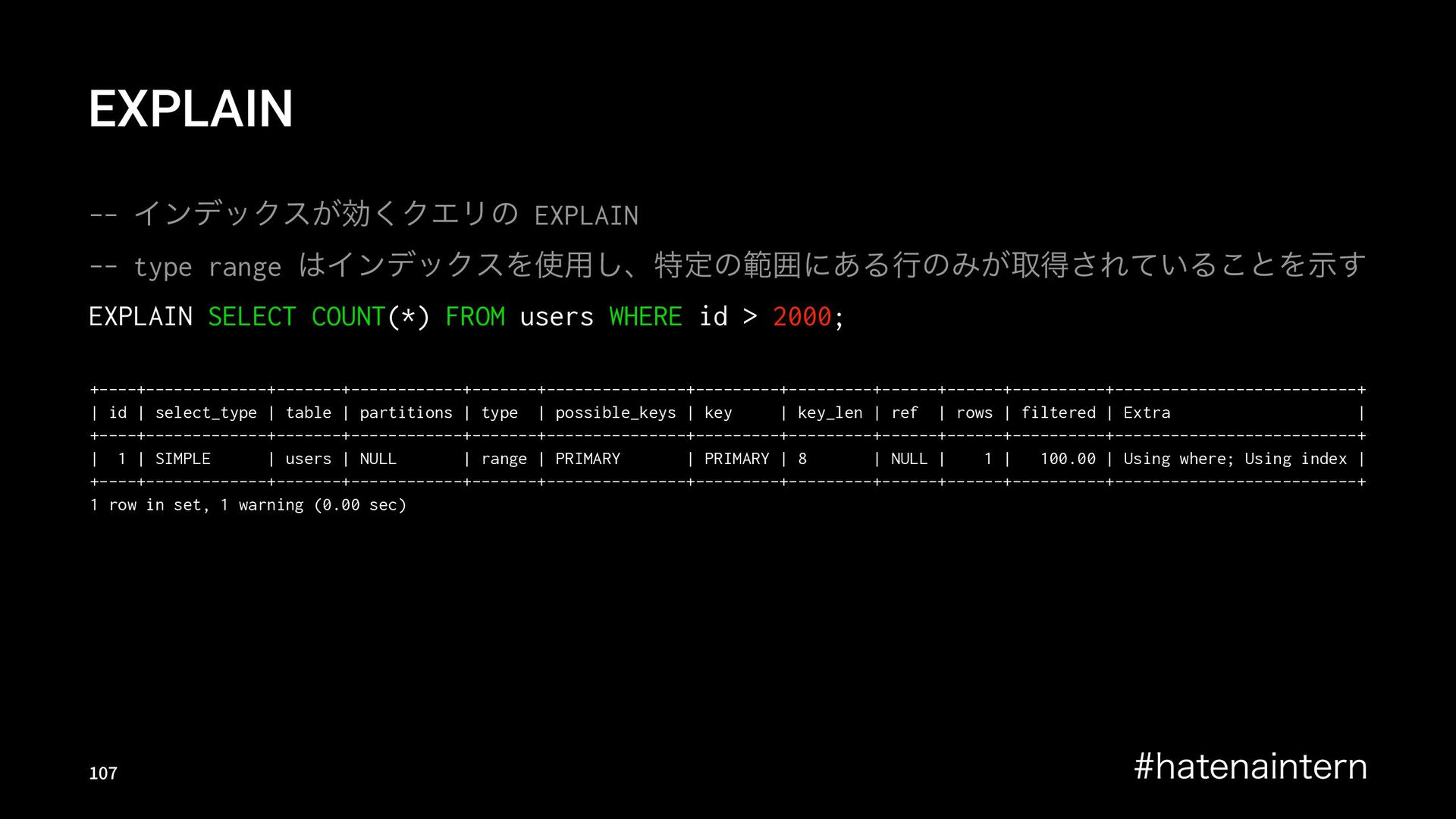 ͷ user ΛՃͯ͠ɺޭ͢Δ INSERT INTO users (id, name, created_at) VALUES (1, 'name1', NOW()); Query OK, 1 row affected (0.01 sec) -- ಉ͡ id ͷΛೖΕΑ͏ͱ͢ΔͱɺΤϥʔʹͳΔ INSERT INTO users (id, name, created_at) VALUES (1, 'name2', NOW()); ERROR 1062 (23000): Duplicate entry '1' for key 'users.PRIMARY' ! クエリの下に書いてあるのは RDBMS から返されてきたクエリの結果。 IBUFOBJOUFSO !"