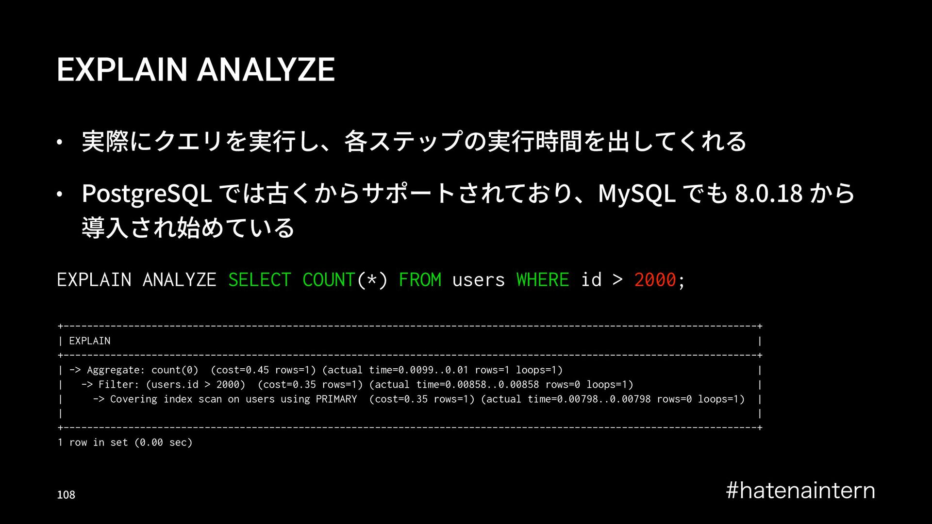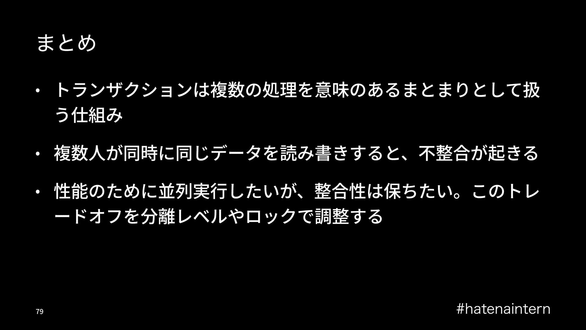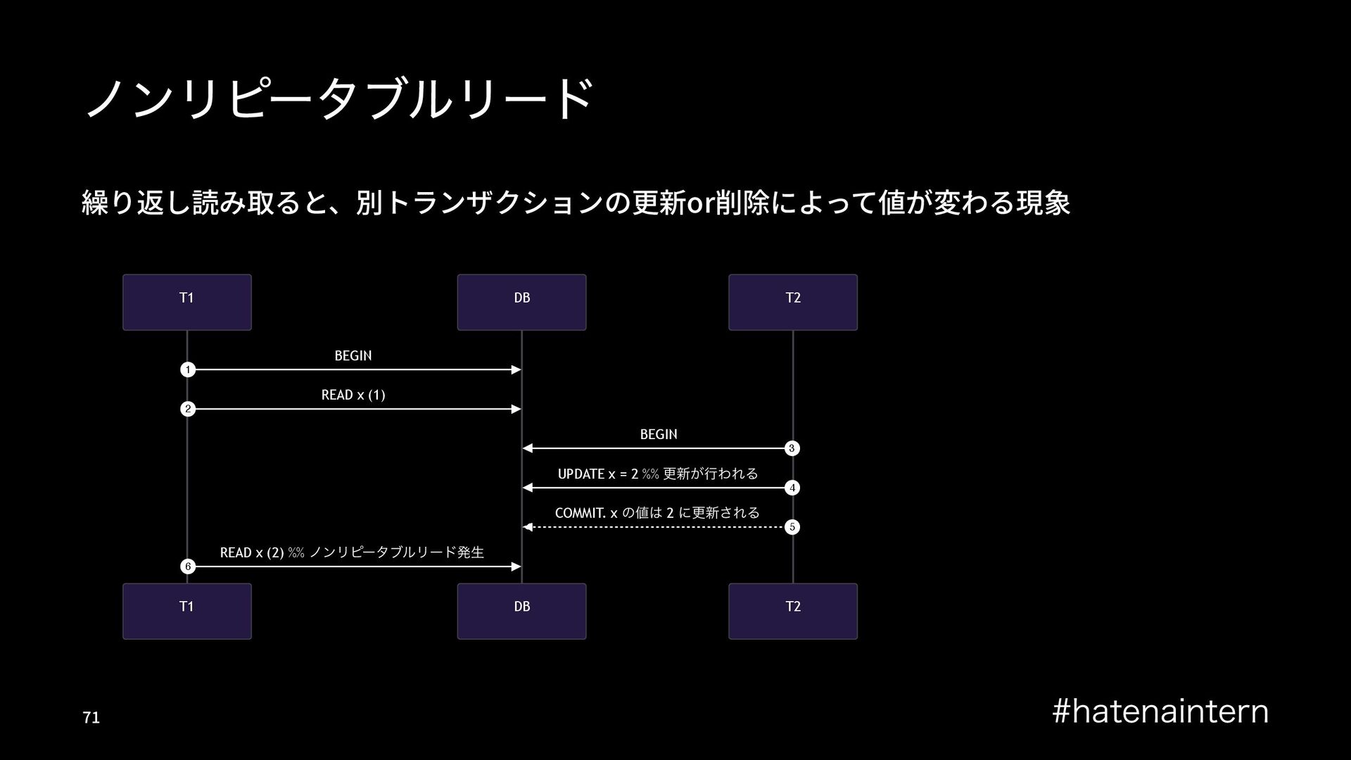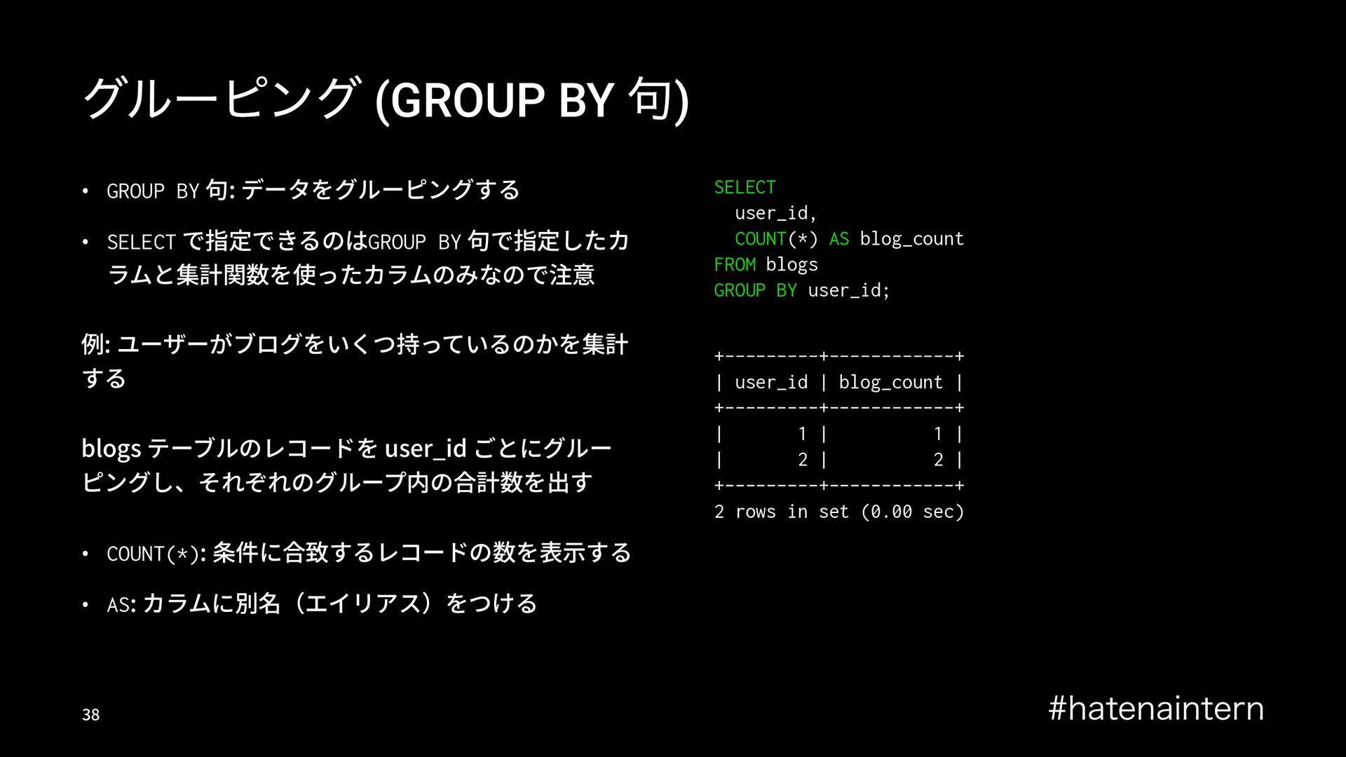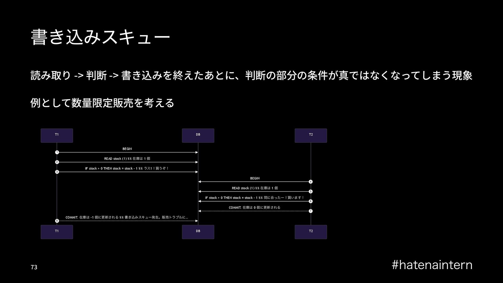 ͷ user ΛՃͯ͠ɺޭ͢Δ INSERT INTO users (id, name, created_at) VALUES (1, 'name1', NOW()); Query OK, 1 row affected (0.01 sec) -- ಉ͡ id ͷΛೖΕΑ͏ͱ͢ΔͱɺΤϥʔʹͳΔ INSERT INTO users (id, name, created_at) VALUES (1, 'name2', NOW()); ERROR 1062 (23000): Duplicate entry '1' for key 'users.PRIMARY' ! クエリの下に書いてあるのは RDBMS から返されてきたクエリの結果。 IBUFOBJOUFSO !"
