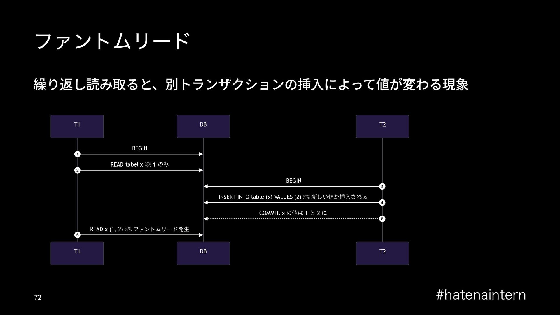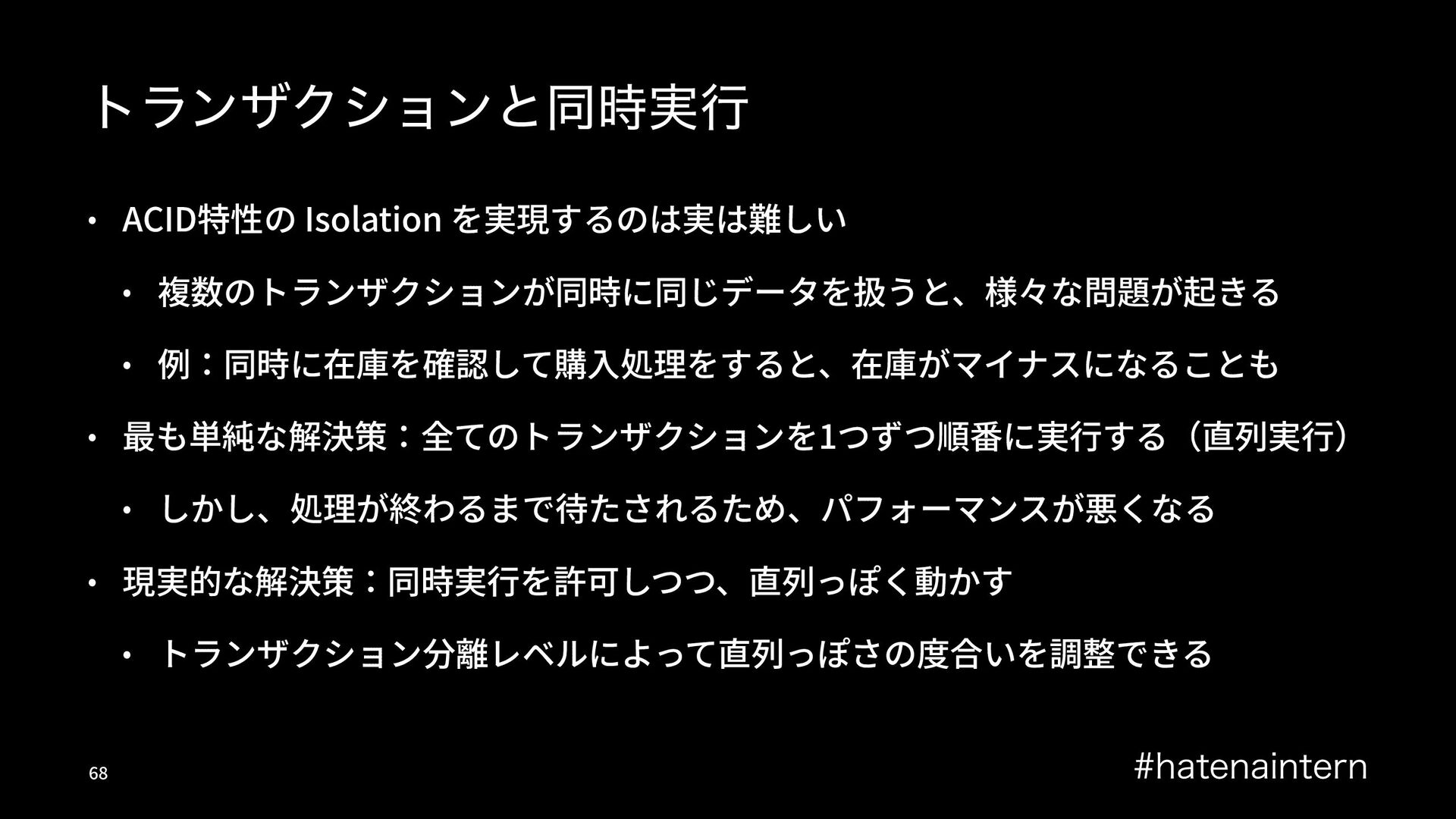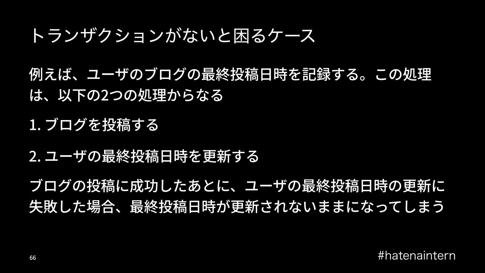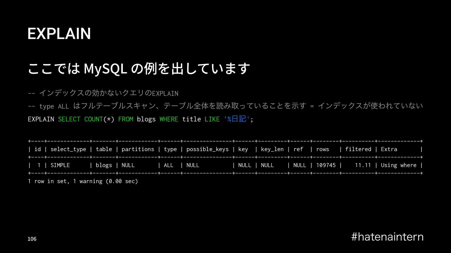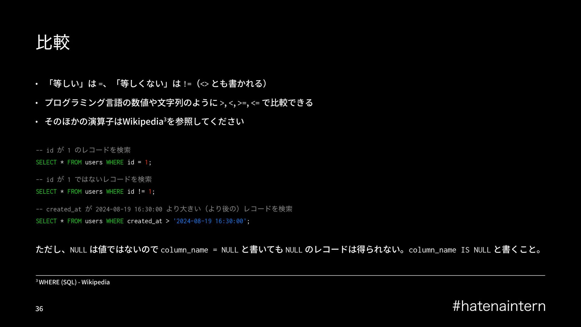 ͷ user ΛՃͯ͠ɺޭ͢Δ INSERT INTO users (id, name, created_at) VALUES (1, 'name1', NOW()); Query OK, 1 row affected (0.01 sec) -- ಉ͡ id ͷΛೖΕΑ͏ͱ͢ΔͱɺΤϥʔʹͳΔ INSERT INTO users (id, name, created_at) VALUES (1, 'name2', NOW()); ERROR 1062 (23000): Duplicate entry '1' for key 'users.PRIMARY' ! クエリの下に書いてあるのは RDBMS から返されてきたクエリの結果。 IBUFOBJOUFSO !"