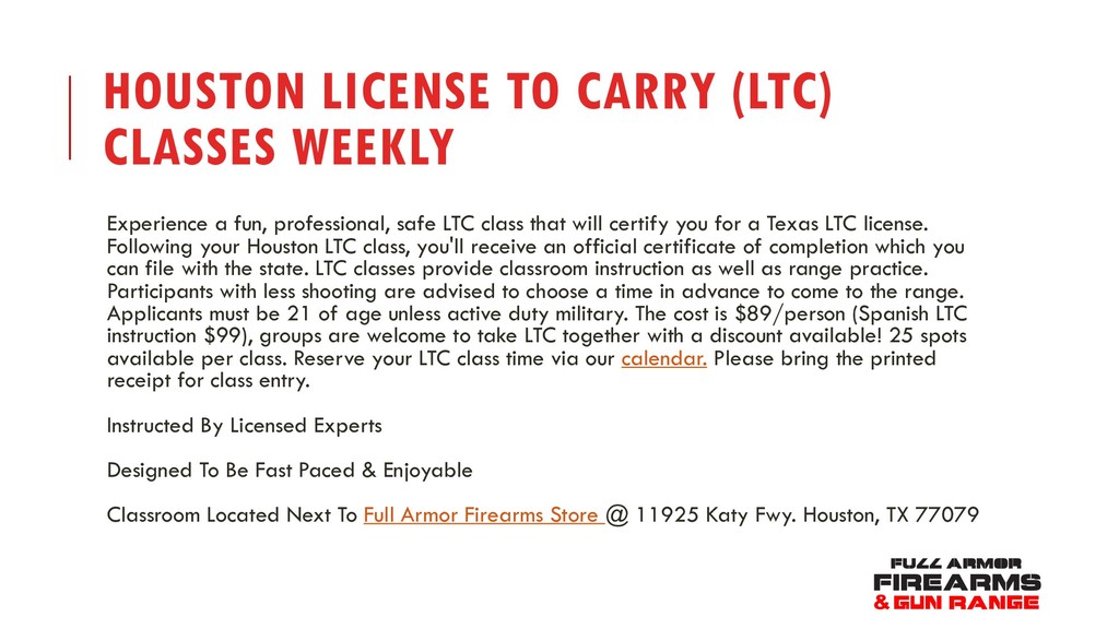 professional, safe LTC class that will certify you for a Texas LTC license. Following your Houston LTC class, you'll receive an official certificate of completion which you can file with the state. LTC classes provide classroom instruction as well as range practice. Participants with less shooting are advised to choose a time in advance to come to the range. Applicants must be 21 of age unless active duty military. The cost is $89/person (Spanish LTC instruction $99), groups are welcome to take LTC together with a discount available! 25 spots available per class. Reserve your LTC class time via our calendar. Please bring the printed receipt for class entry. Instructed By Licensed Experts Designed To Be Fast Paced & Enjoyable Classroom Located Next To Full Armor Firearms Store @ 11925 Katy Fwy. Houston, TX 77079