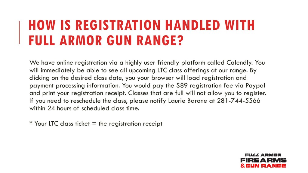 have online registration via a highly user friendly platform called Calendly. You will immediately be able to see all upcoming LTC class offerings at our range. By clicking on the desired class date, you your browser will load registration and payment processing information. You would pay the $89 registration fee via Paypal and print your registration receipt. Classes that are full will not allow you to register. If you need to reschedule the class, please notify Laurie Barone at 281-744-5566 within 24 hours of scheduled class time. * Your LTC class ticket = the registration receipt
