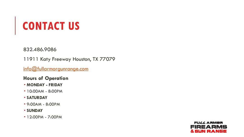 AT FULL ARMOR? Most people that have taken the class that are range, they give it five stars. I mean, we really take pride in our reputation and do a great job. We have a great process for the course. Our classroom structures are energetic, and our instructors are thorough. They go through all the safety information that you'll need. They go through the laws that will protect you in case you have to use your firearm, so that you know what's going to happen after you use it.