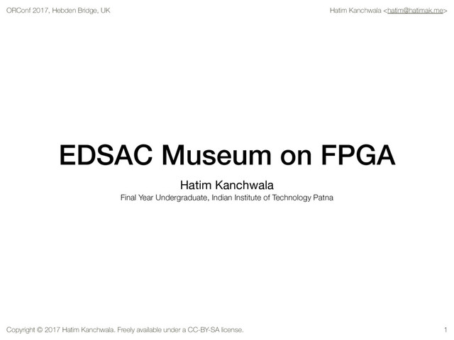 2017 Hatim Kanchwala. Freely available under a CC-BY-SA license. EDSAC Museum on FPGA Hatim Kanchwala Final Year Undergraduate, Indian Institute of Technology Patna 1