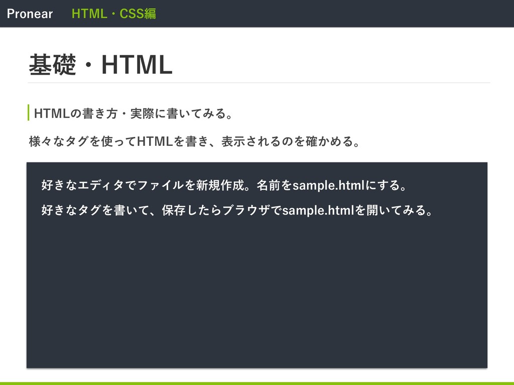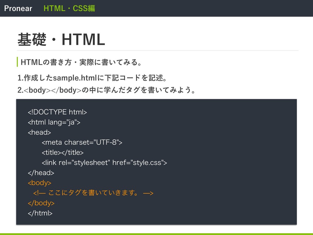 1SPOFBS )5.-ɾ$44ฤ جૅɾ)5.- )5.-ͷॻ͖ํɾ࣮ࡍʹॻ͍ͯΈΔɻ ࡞ͨ͠TBNQMFIUNMʹԼهίʔυΛهड़ɻ CPEZCPEZͷதʹֶΜͩλάΛॻ͍ͯΈΑ͏ɻ %0$5:1&IUNM IUNMMBOHKB IFBE