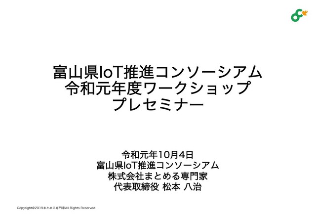 2019年10月4日に開催しました「富山IoT推進コンソーシアム 令和元年度ワークショップ」プレセミナーでの進行スライドになります。