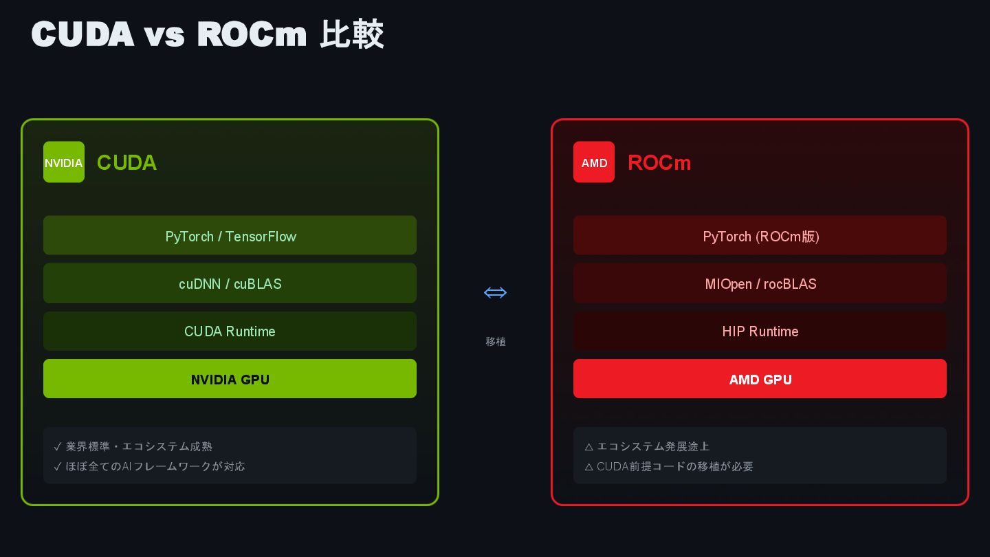 / cuBLAS CUDA Runtime NVIDIA GPU ✓ 業界標準・エコシステム成熟 ✓ ほぼ全てのAIフレームワークが対応 ⇔ 移植 AMD ROCm PyTorch (ROCm版) MIOpen / rocBLAS HIP Runtime AMD GPU △ エコシステム発展途上 △ CUDA前提コードの移植が必要