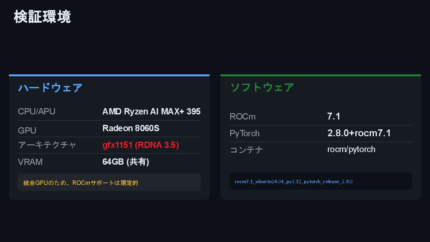 8060S アーキテクチャ gfx1151 (RDNA 3.5) VRAM 64GB (共有) 統合GPUのため、ROCmサポートは限定的 ソフトウェア ROCm 7.1 PyTorch 2.8.0+rocm7.1 コンテナ rocm/pytorch rocm7.1_ubuntu24.04_py3.12_pytorch_release_2.8.0