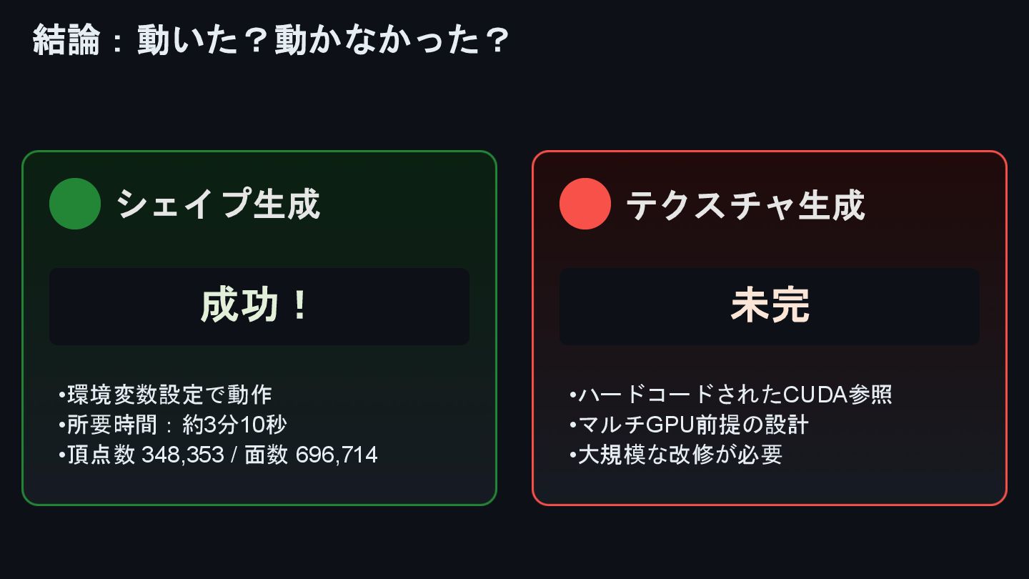 3. 結論:動いた?動かなかった? シェイプ生成 成功! •環境変数設定で動作 •所要時間:約3分10秒 •頂点数 348,353 / 面数 696,714